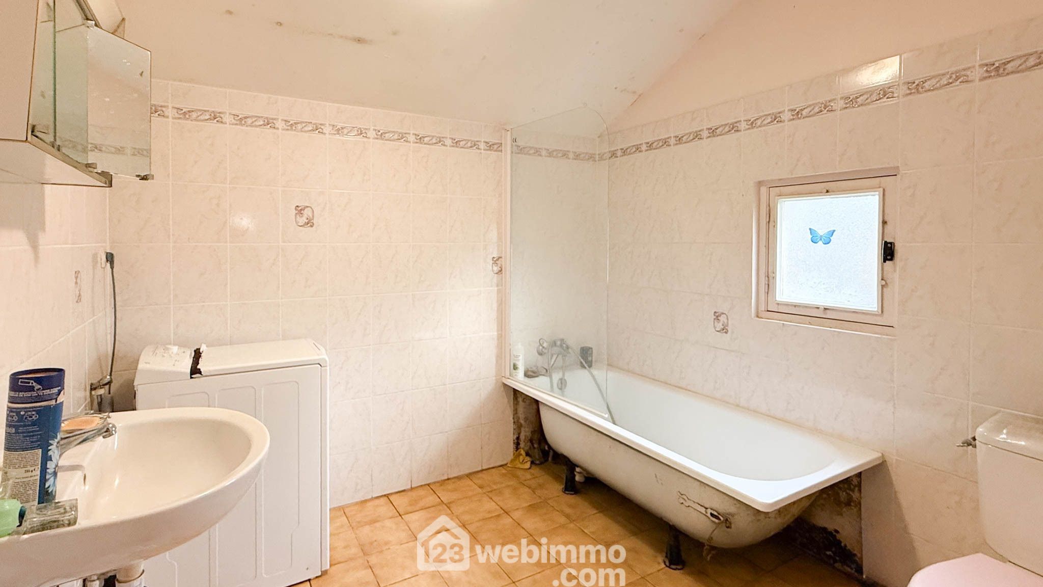 Dès l’entrée, vous découvrirez une cuisine de 21.80m² aménagée et équipée (hotte, four, plaque gaz, réfrigérateur), agrémentée d’un poêle à granulés, ouvrant sur un séjour de 26.25m² au sol en tomettes, apportant charme et authenticité. La cuisine dessert également une salle de bains avec WC. Un dégagement mène ensuite à deux chambres de 10.15 et 12.57m².