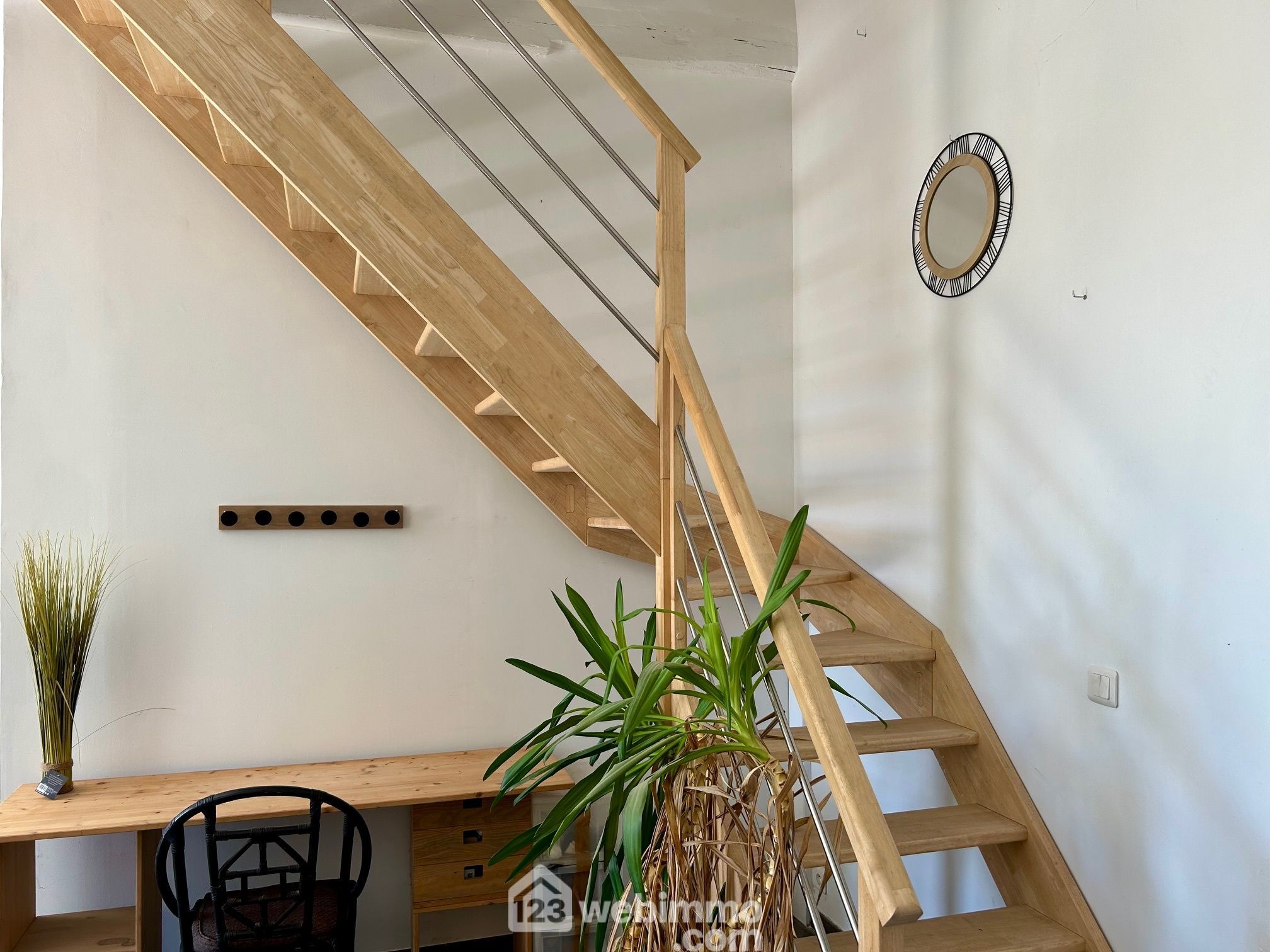 L'escalier contemporain mène au palier de l'étage qui dessert 2 chambres lumineuses de 18 et 13 m2 exposées Sud-Est, dont une avec un grand meuble dressing, une salle d'eau rationnelle et optimisée, avec douche et WC et un grenier de rangement.