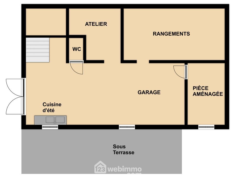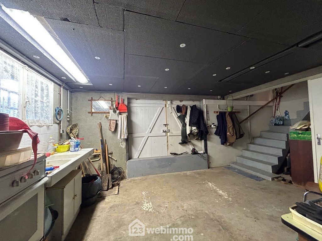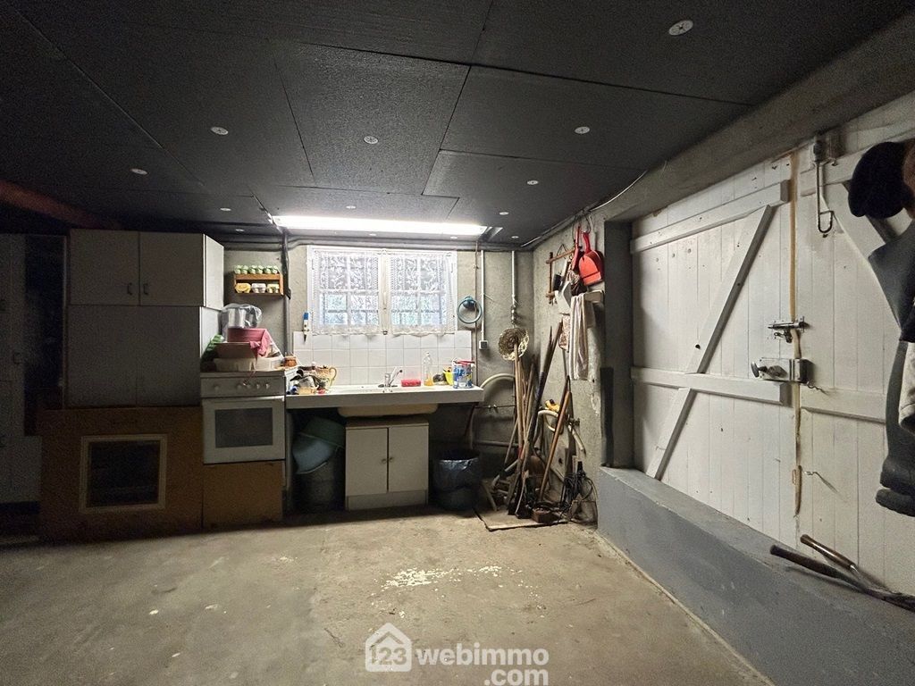 En rez-de-jardin, un garage de 54 m2 avec un coin cuisine d'été face au jardin, un WC, un atelier, un grand rangement et une pièce chauffée avec fenêtre potentiellement utilisable en chambre d'appoint, avec possibilité de transformation en studio.