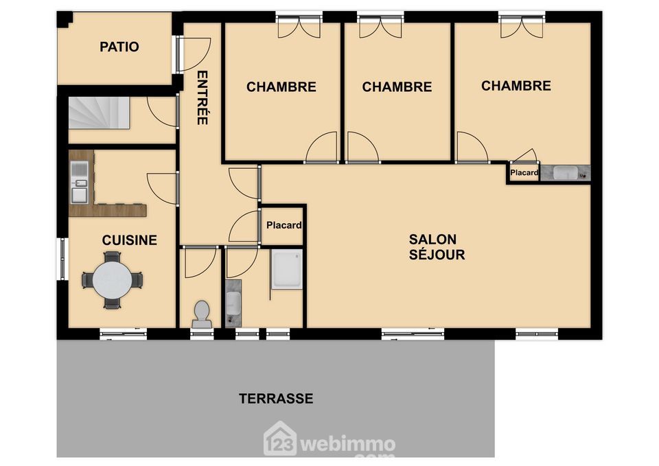 Les trois chambres, dont une grande avec point d'eau, sont lumineuses : chacune dispose d'une porte-fenêtre.