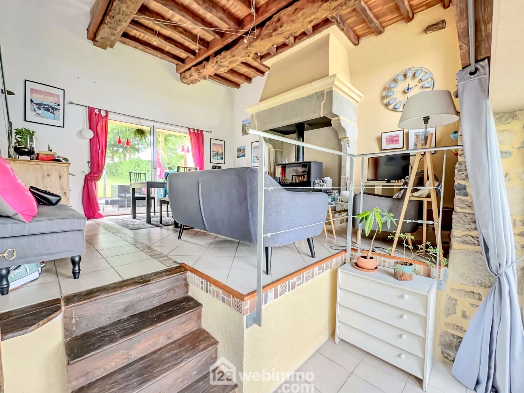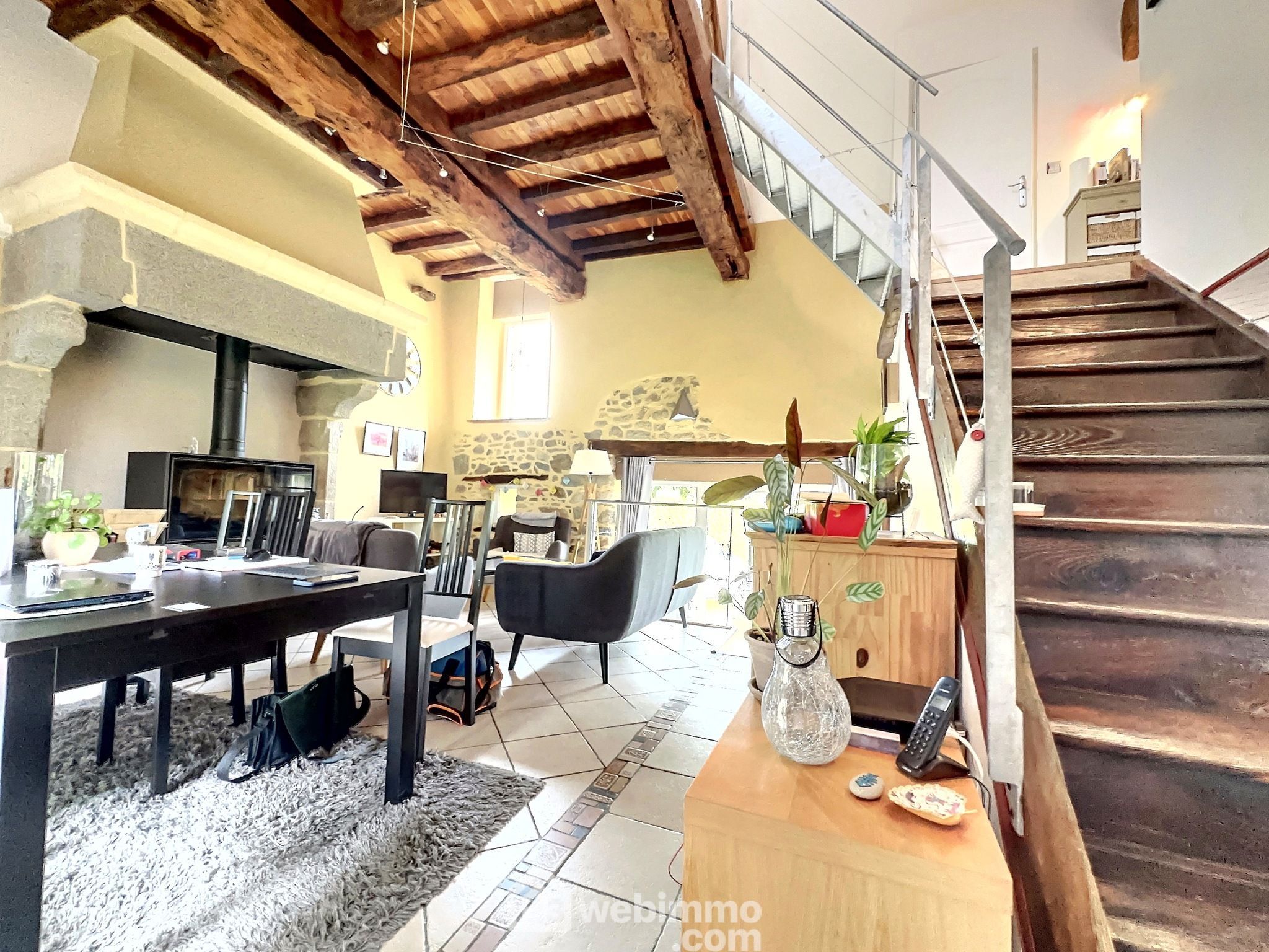 -Dès l’entrée, vous serez charmé par le salon séjour lumineux, au plafonds haut avec des poutres apparentes d’époque et une grande cheminée en pierre reconvertie en poêle à bois.