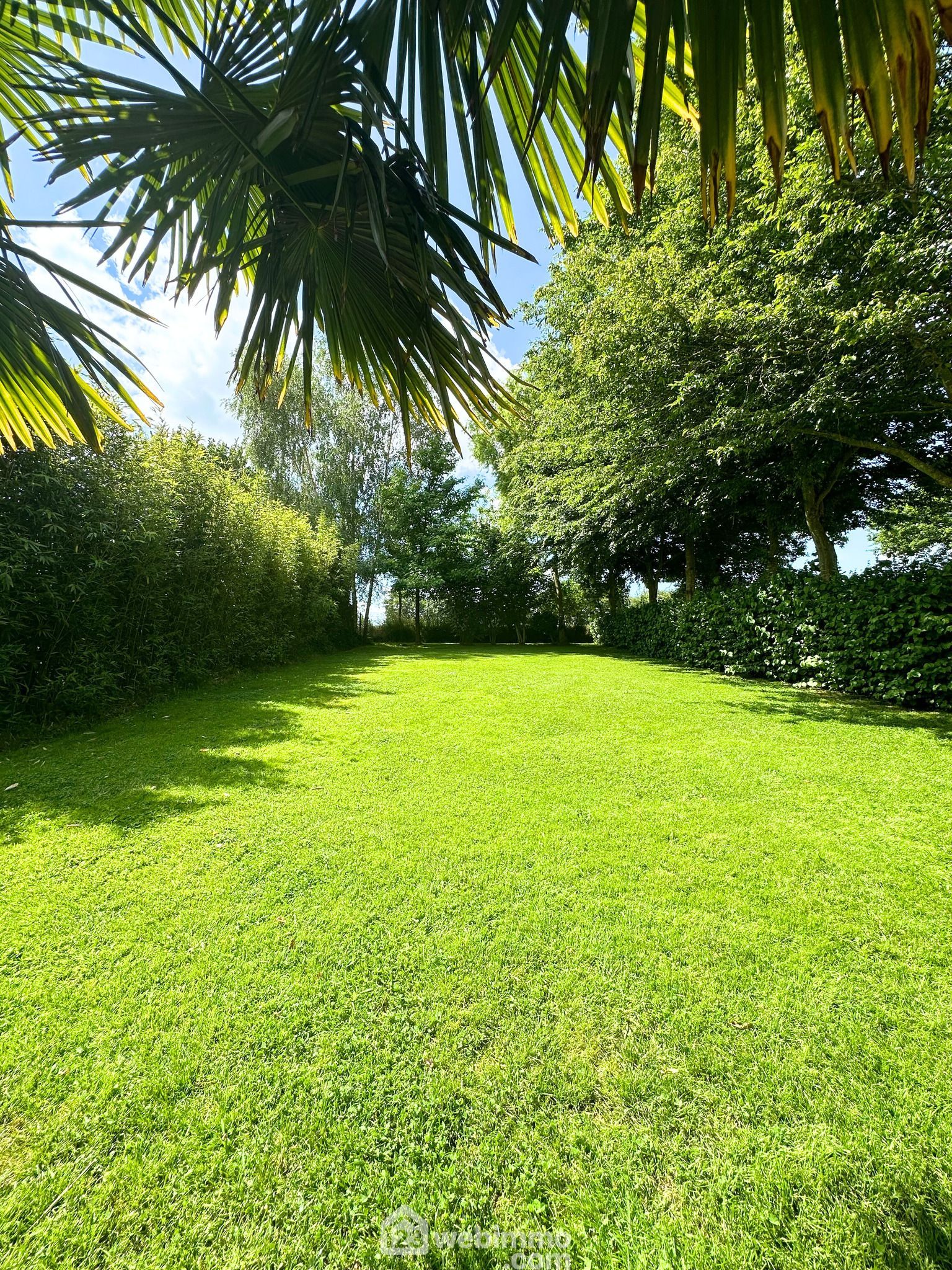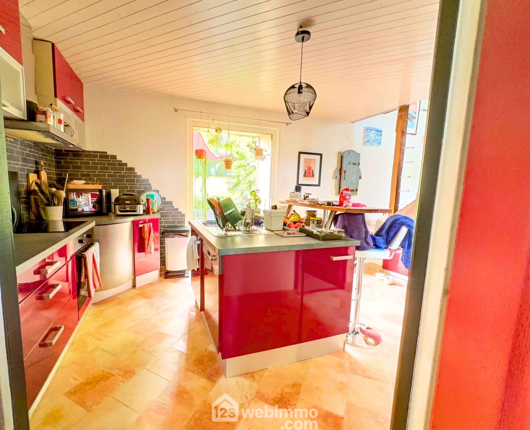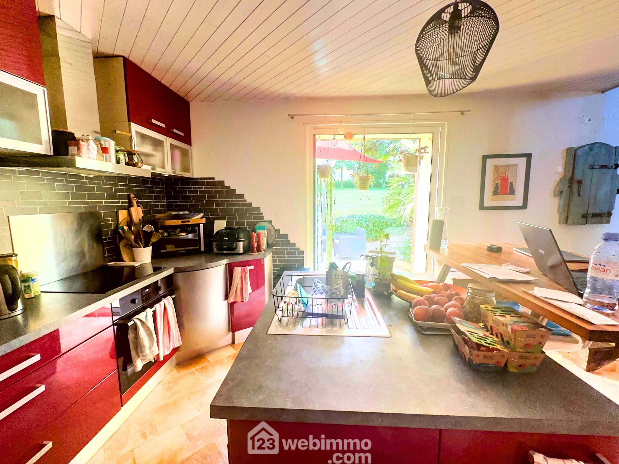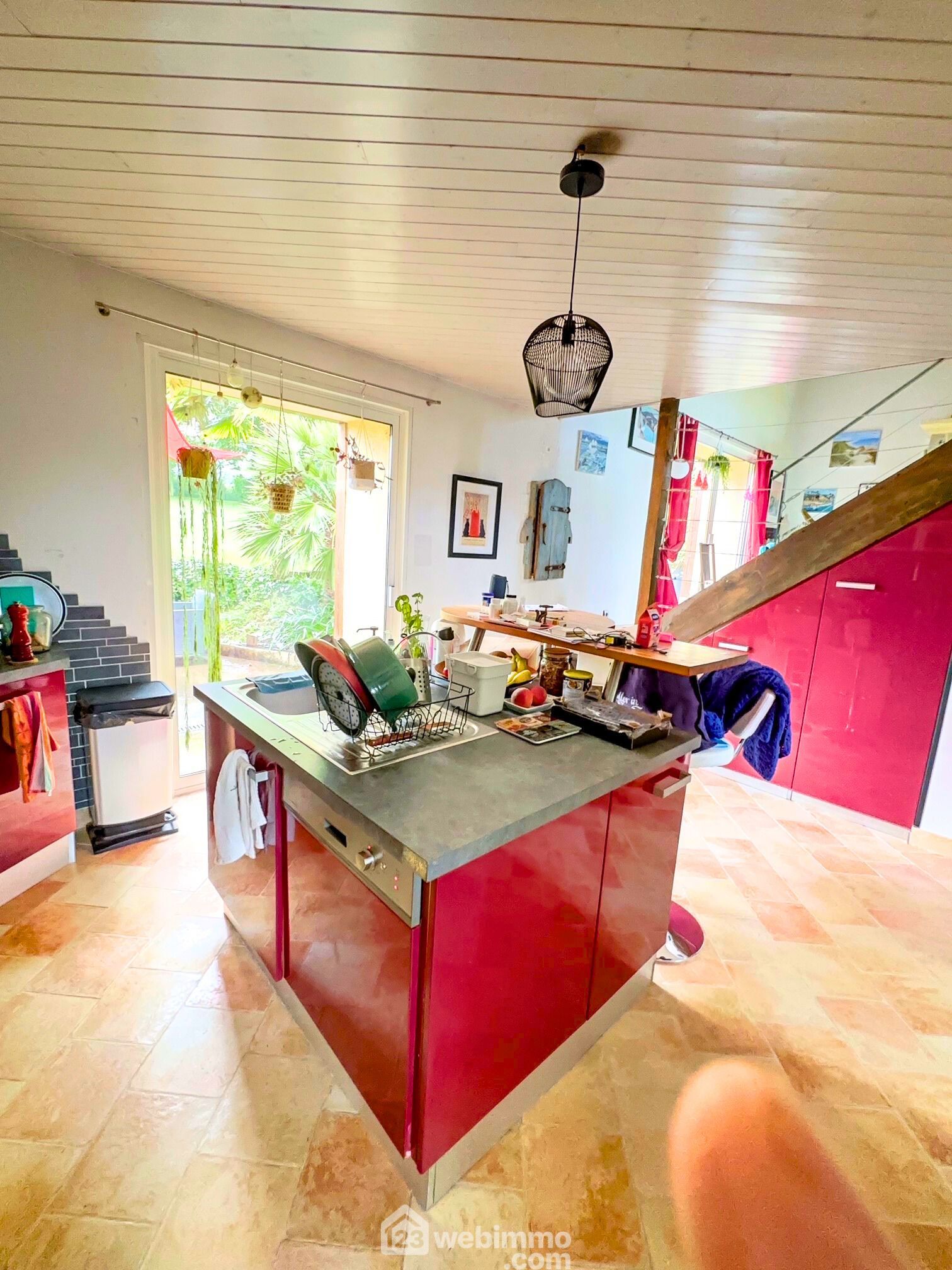 -Quelques marches vous mèneront à une spacieuse cuisine dinatoire entièrement équipée, avec un îlot central doté de nombreux espaces de rangement. La cuisine s'ouvre sur une terrasse astucieusement aménagée, parfaite pour des repas en plein air dans le cadre verdoyant d'un jardin paysager qui la prolonge.