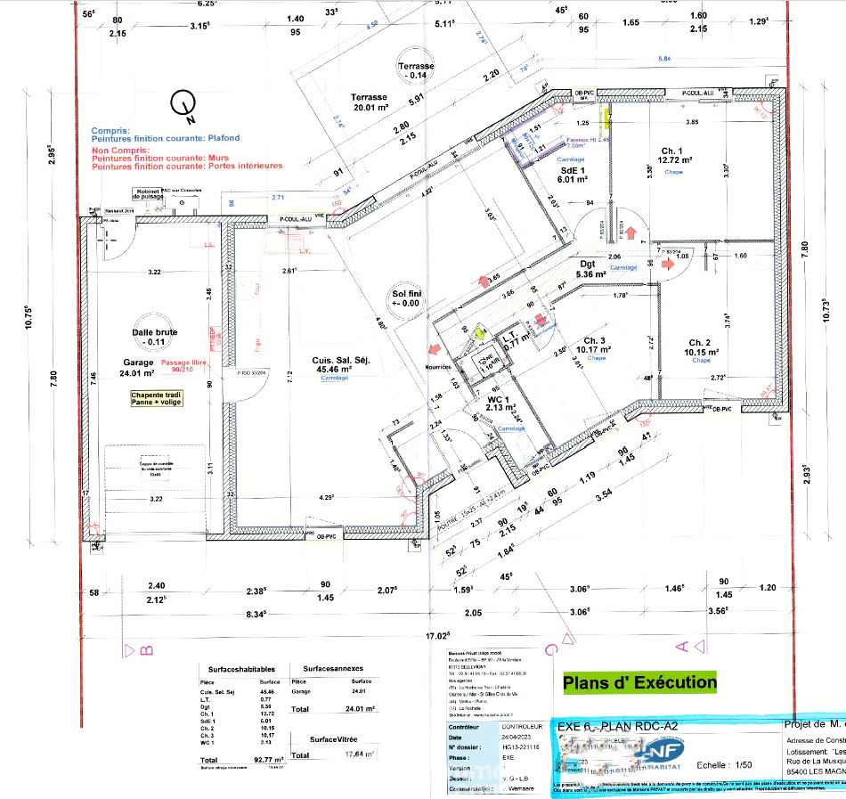 Elle se compose d'une entrée avec espace placard, une grande pièce de vie d'environ 45 m² exposée plein sud avec cuisine ouverte, 3 chambres (2 de + de 10 m² et 1 de près de 13 m²) dont 2 avec espace placard, une grande salle d'eau (6 m²) avec douche carrelée et son receveur extra plat, un wc indépendant avec lave-mains et un garage d'environ 24 m² avec porte séquentielle.