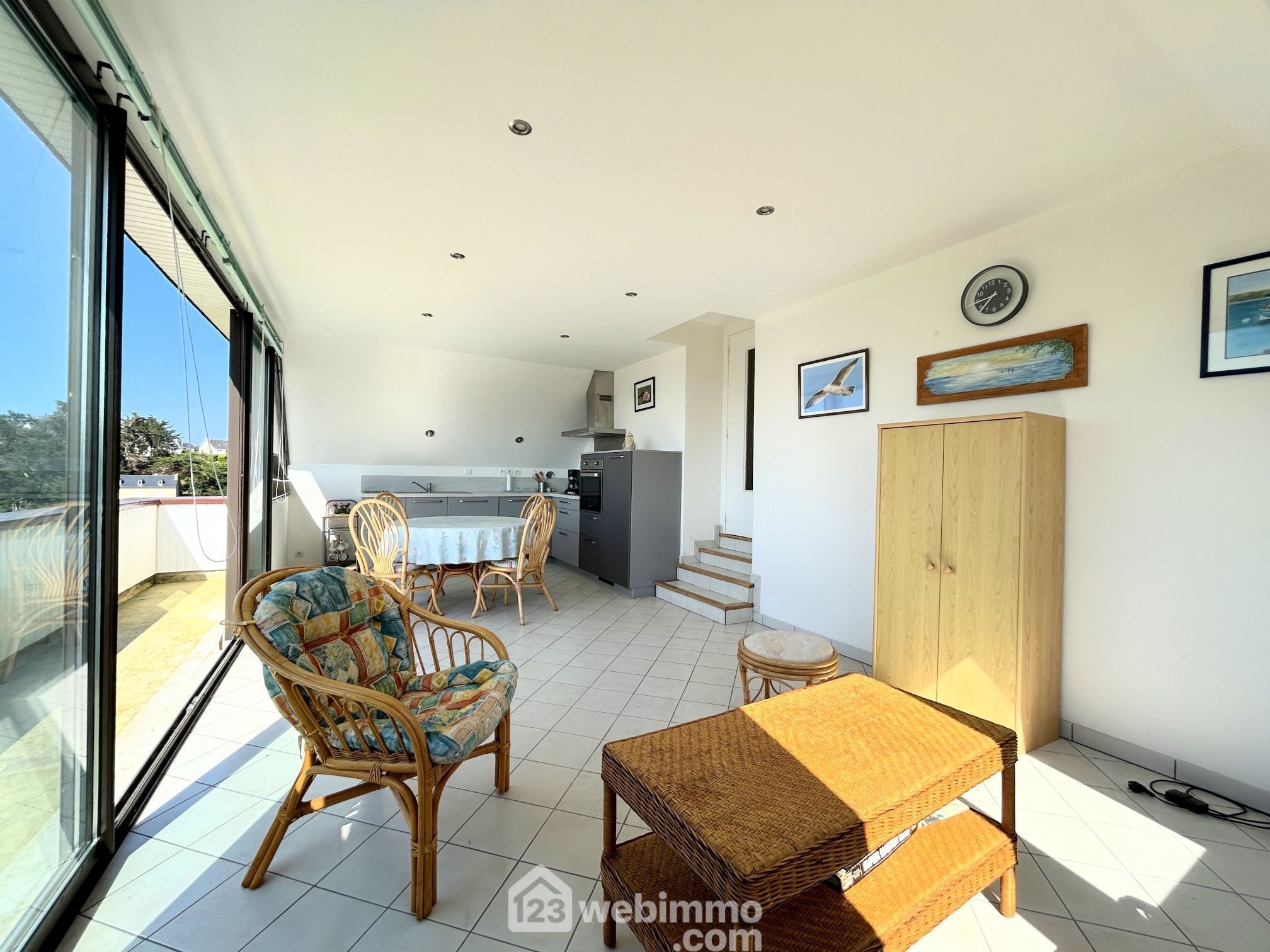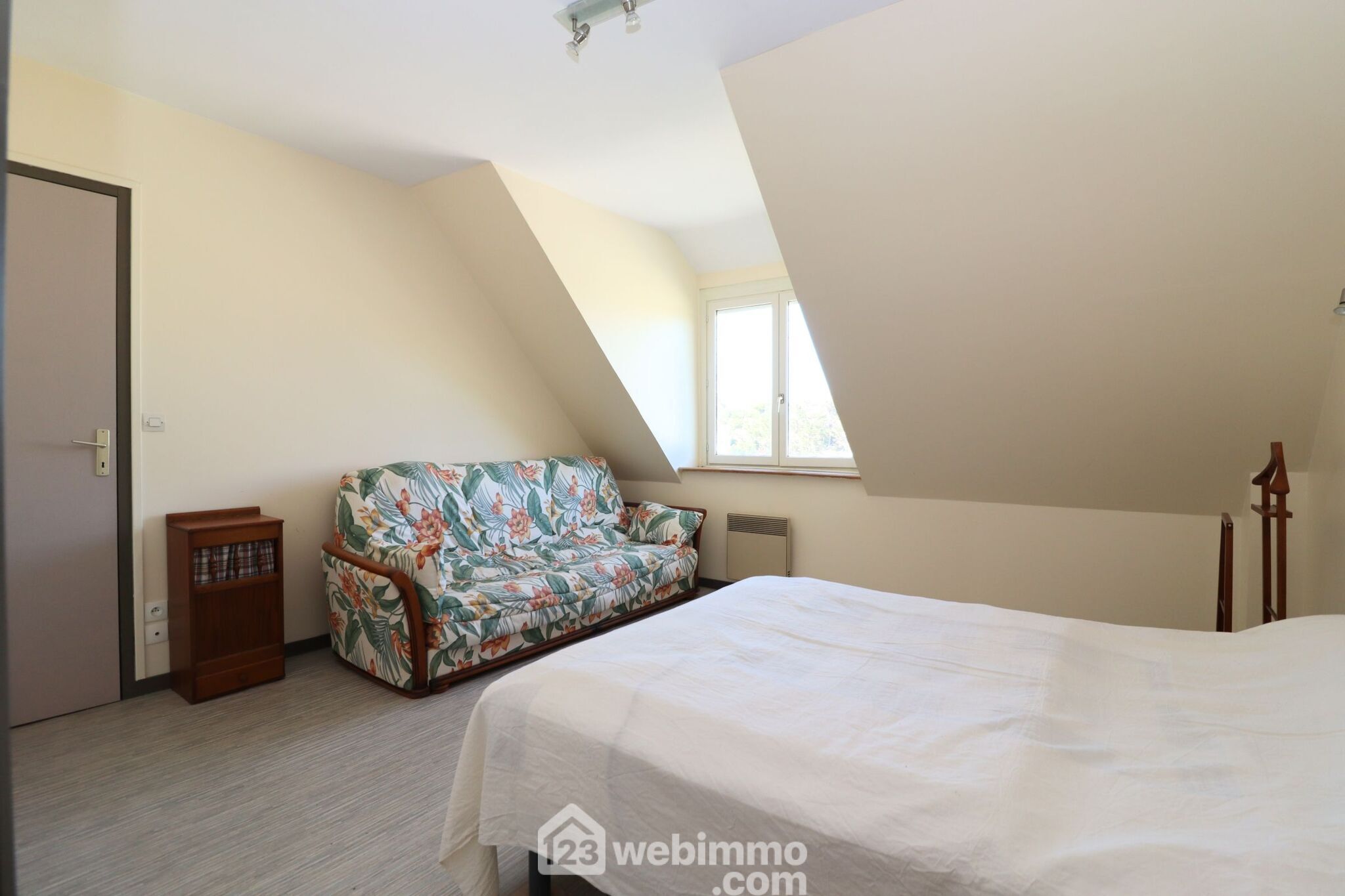 A l'étage, le palier dessert une seconde pièce de vie de 27m2 avec cuisine aménagée et équipée SCHMIDT prolongée d'un balcon de 7m2 offrant une vue imprenable du port de Locquémeau jusqu'à la pointe de Roskoualc'h. L'étage se poursuit avec 2 chambres de 15m2 et 13,5m2 au sol (12 et 11m2 habitables) ainsi qu'un cabinet de toilette transformable en salle de douches avec WC.