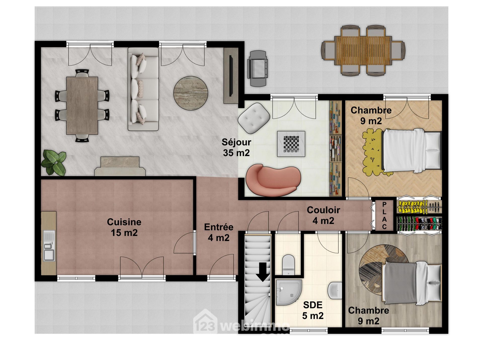 Maison sur sous-sol avec vie de plain-pied, 94 m2 habitables, 4 pièces, 3 chambres, sur un terrain de 2000 m2.