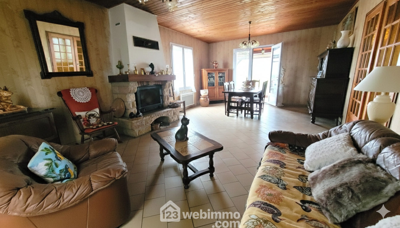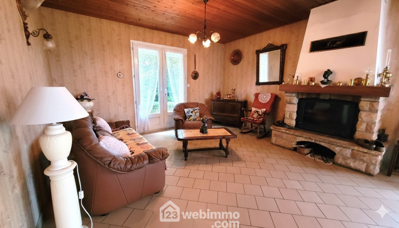 Belle pièce de vie lumineuse avec cheminée insert, ouvrant sur une véranda, idéale pour profiter du jardin en toute saison