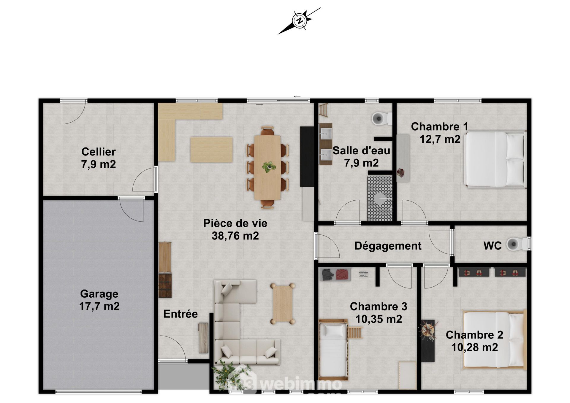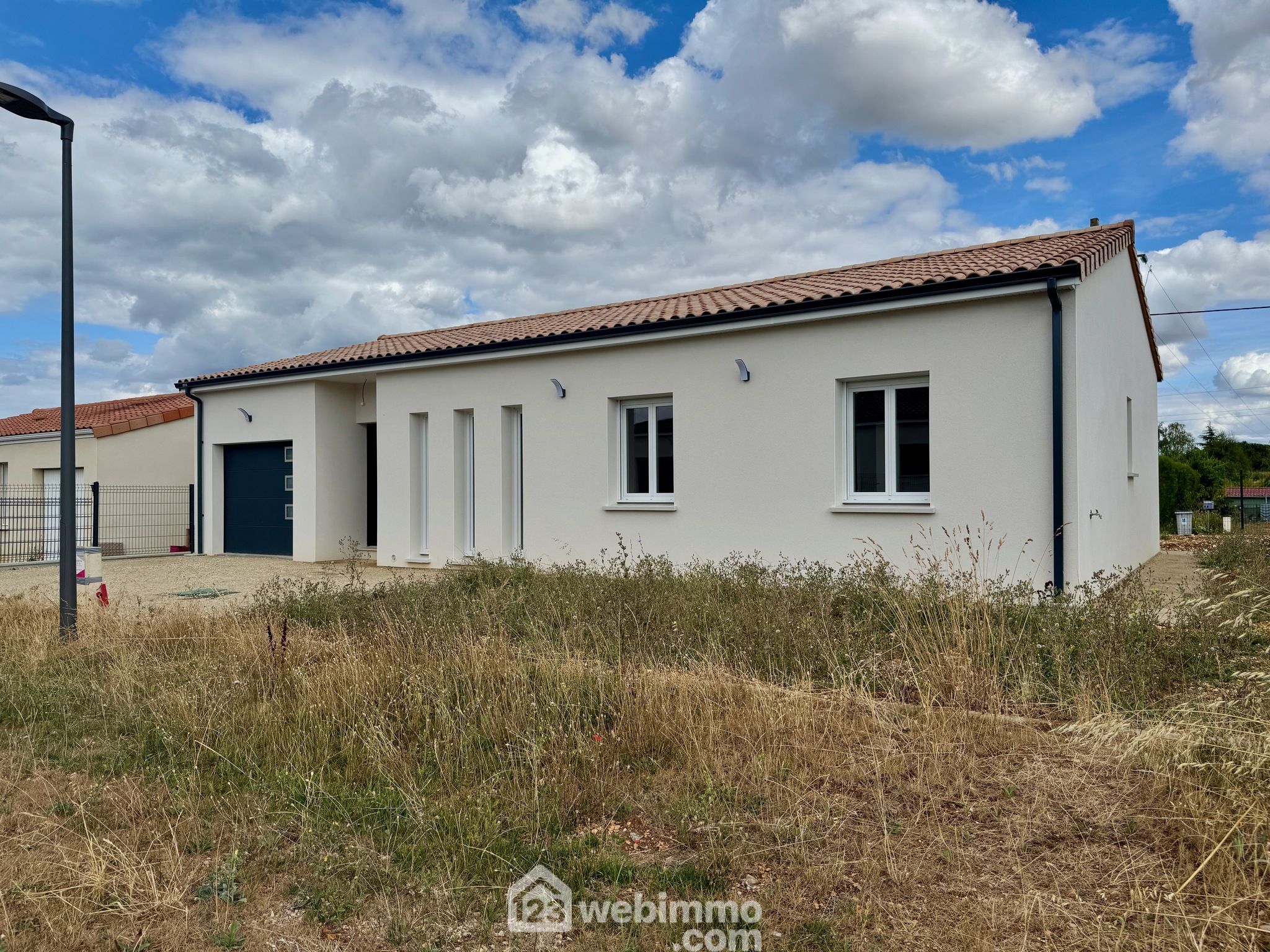 Pavillon plain-pied de 2025, 95 m2 habitables, 4 pièces, 3 chambres, cellier-chaufferie, garage, terrain de 435 m2.