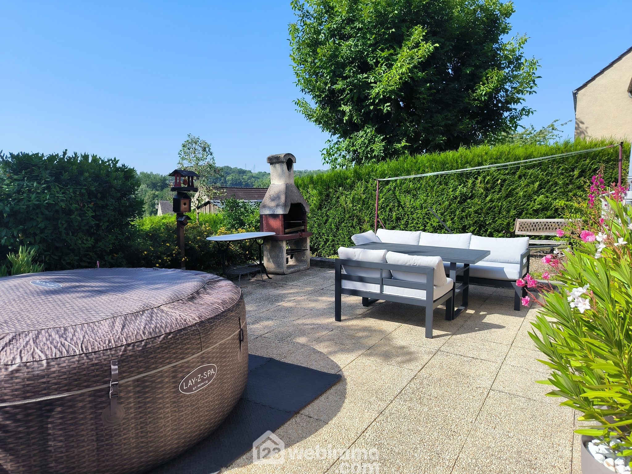 Côté extérieur, vous apprécierez une grande terrasse de 35 m², bien exposée, avec une vue dégagée pour vos moments de détente. Le jardin clos et arboré invite au calme et à la convivialité. Un garage ainsi qu’une cour permettent de stationner plusieurs véhicules.