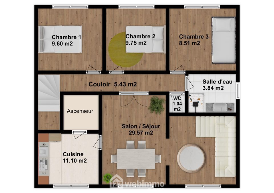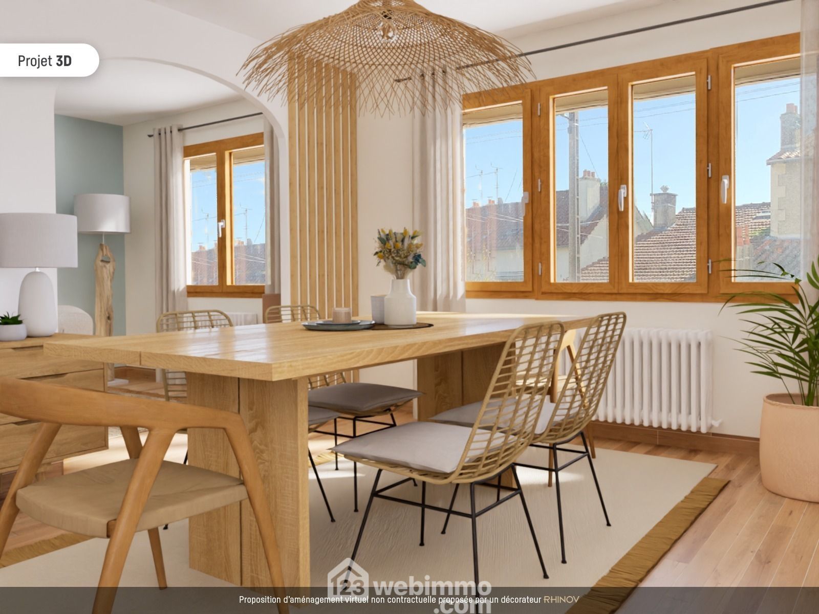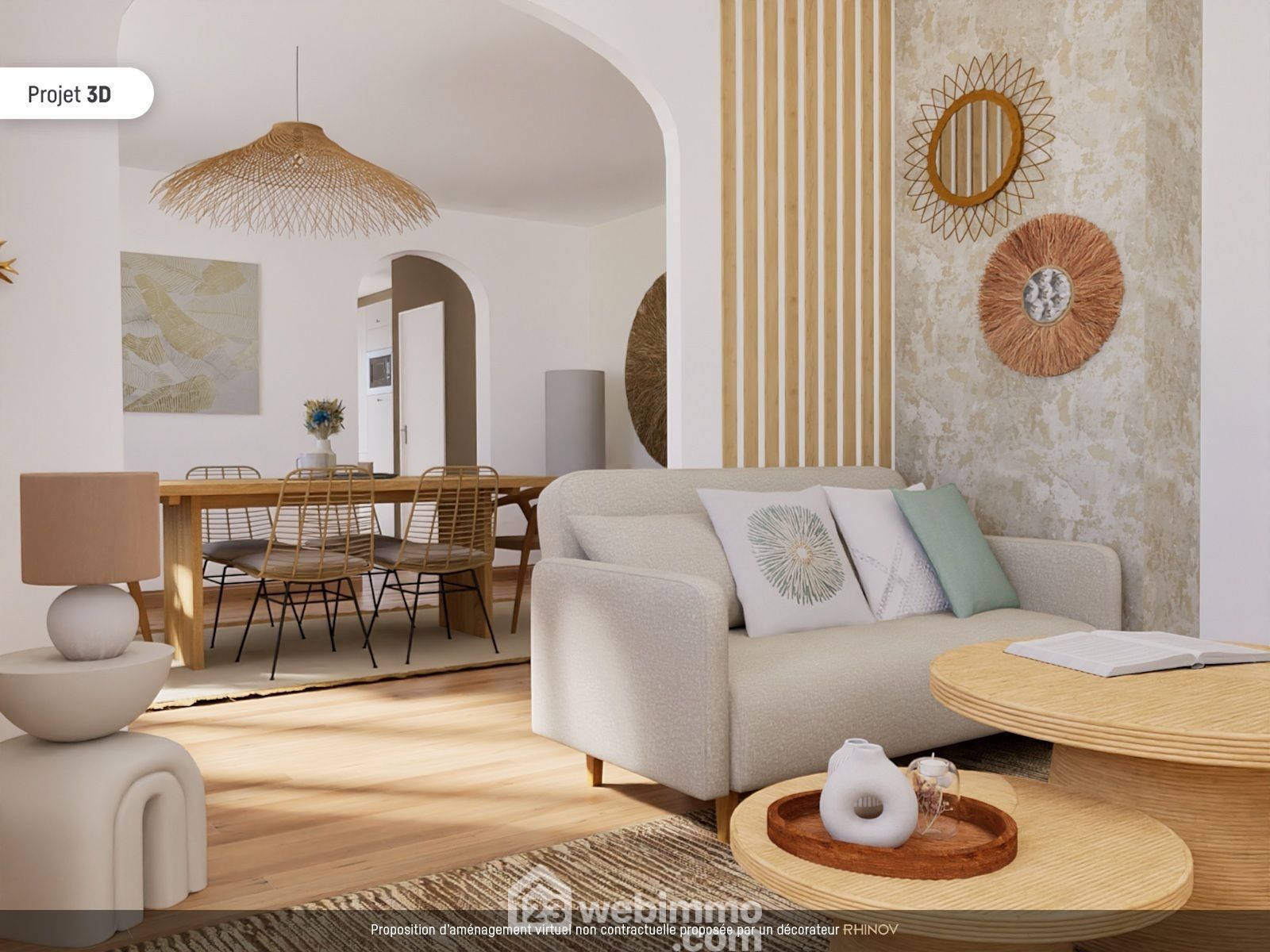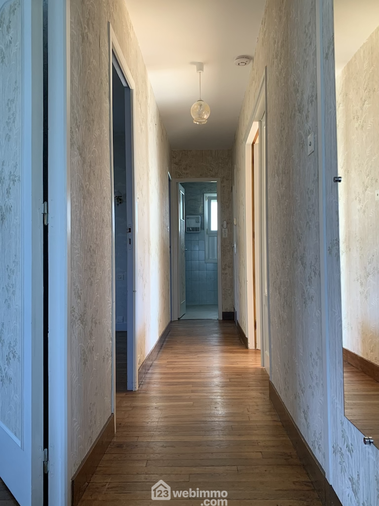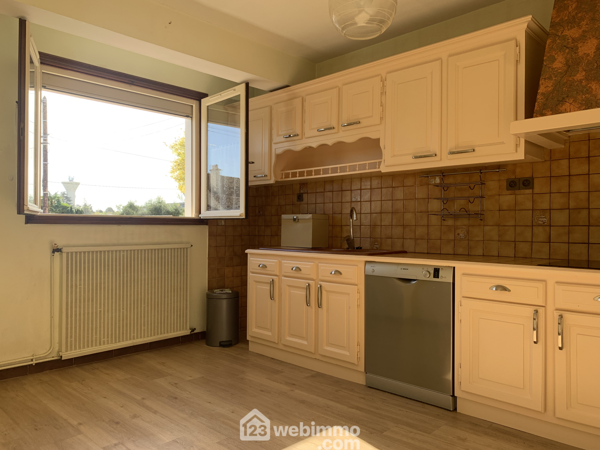 À l'étage, un couloir distribue l'ensemble des pièces : salon / séjour d'environ 30 m2, cuisine aménagée, 3 chambres, salle d'eau et WC.