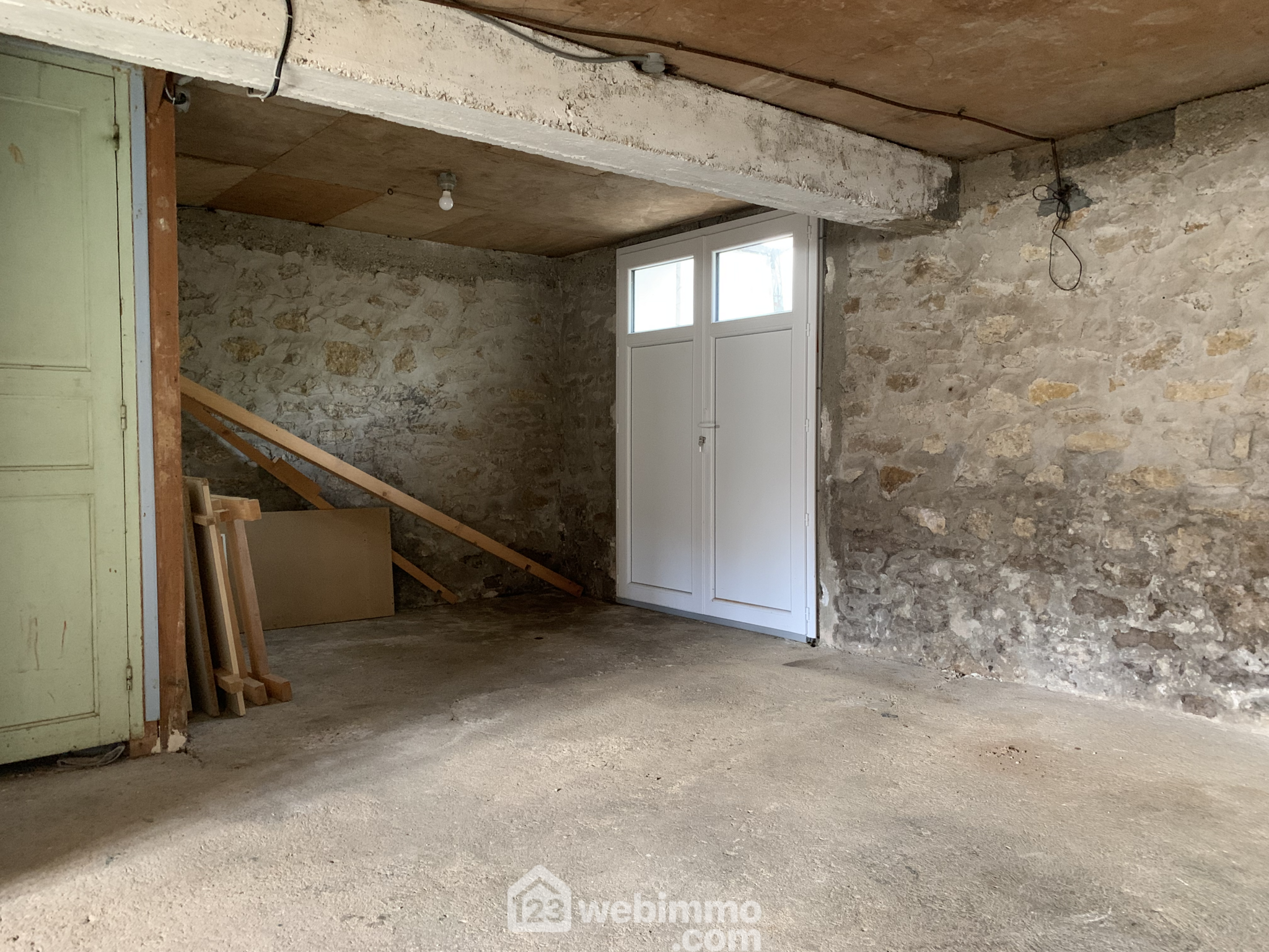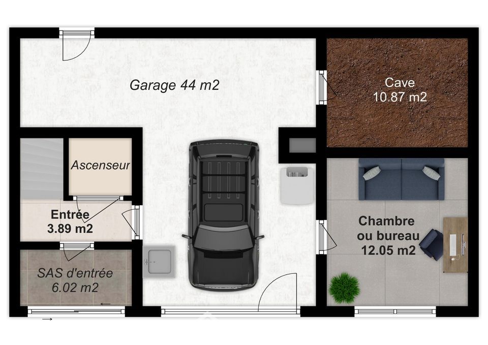 86000 Poitiers, quartier Prés Mignons. Au sous-sol semi-enterré : un sas d'entrée non-chauffé ouvert sur une entrée avec accès ascenseur, une chambre ou bureau, un garage et une cave.