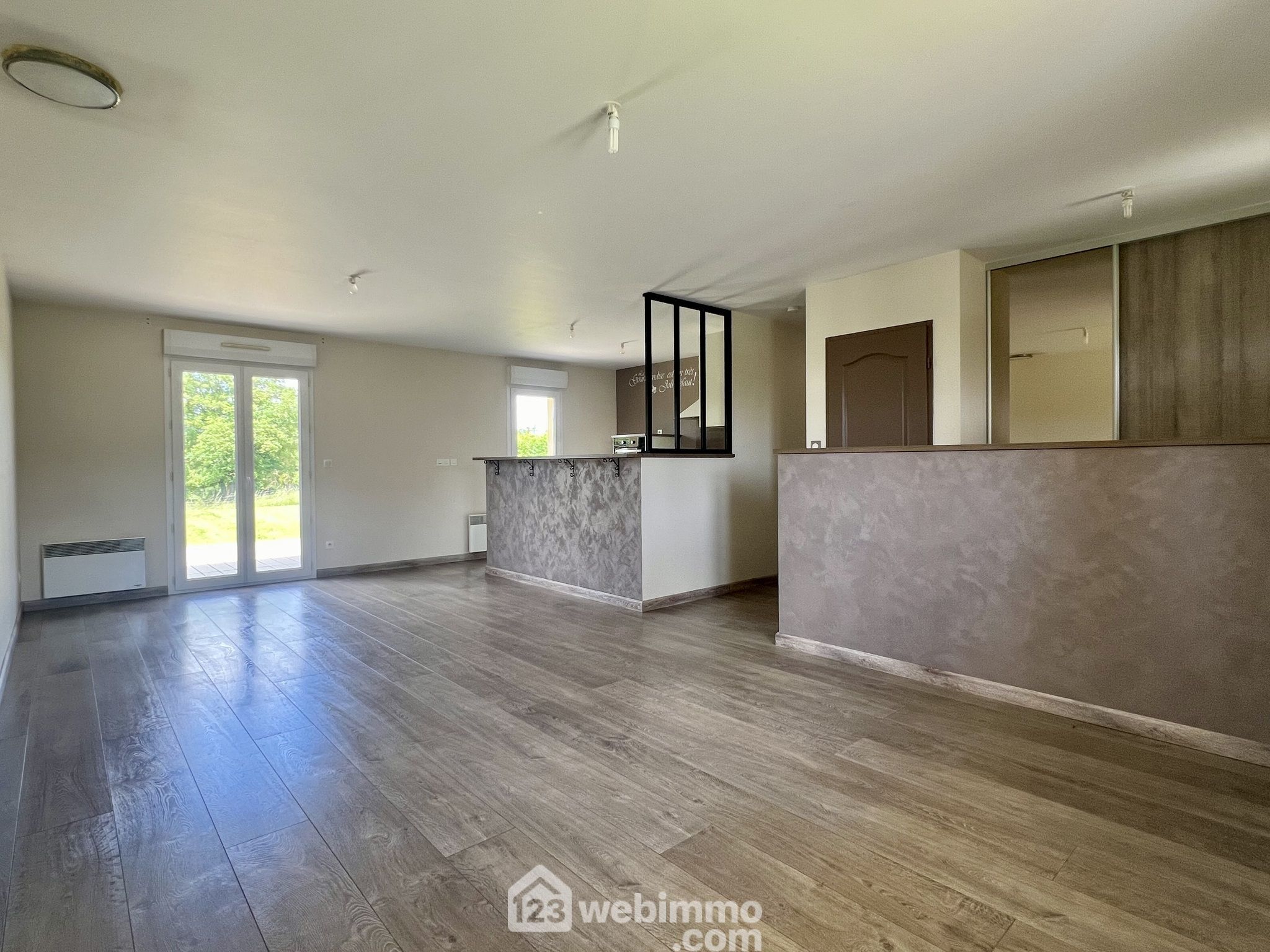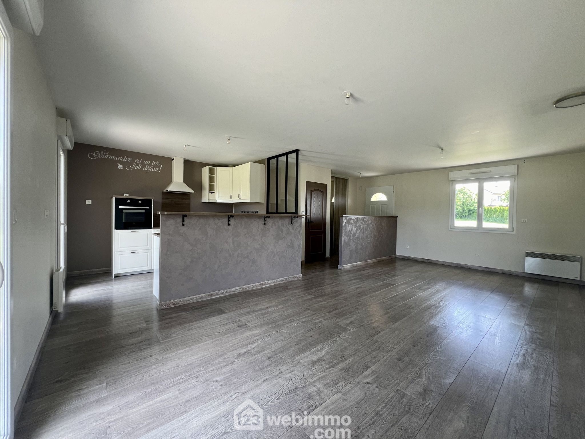 Ce plain-pied sur sous-sol dispose d'un espace de vie de 41m² composé d'une entrée avec placard et d'un salon-séjour avec cuisine équipée ouverte de 36 m².
