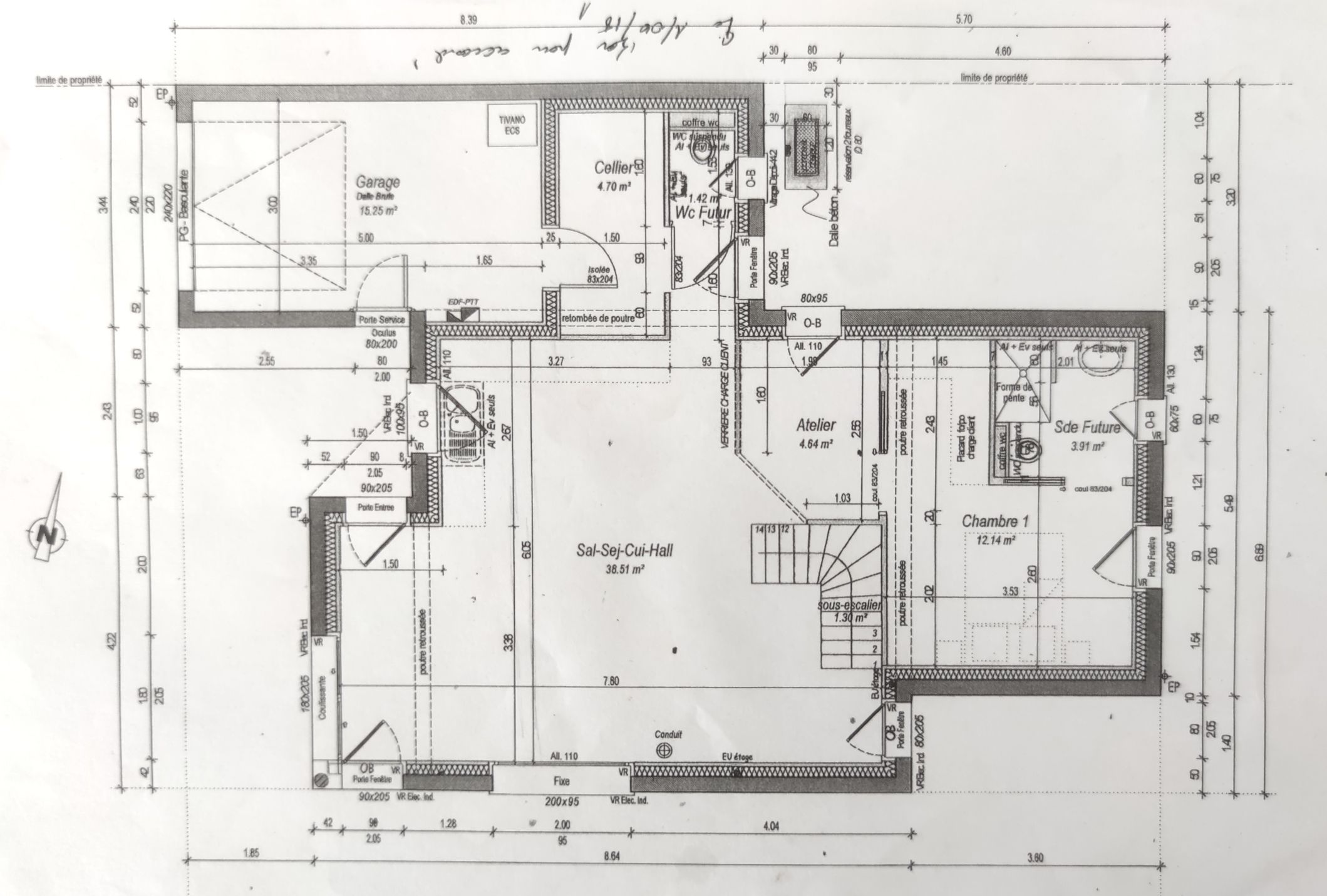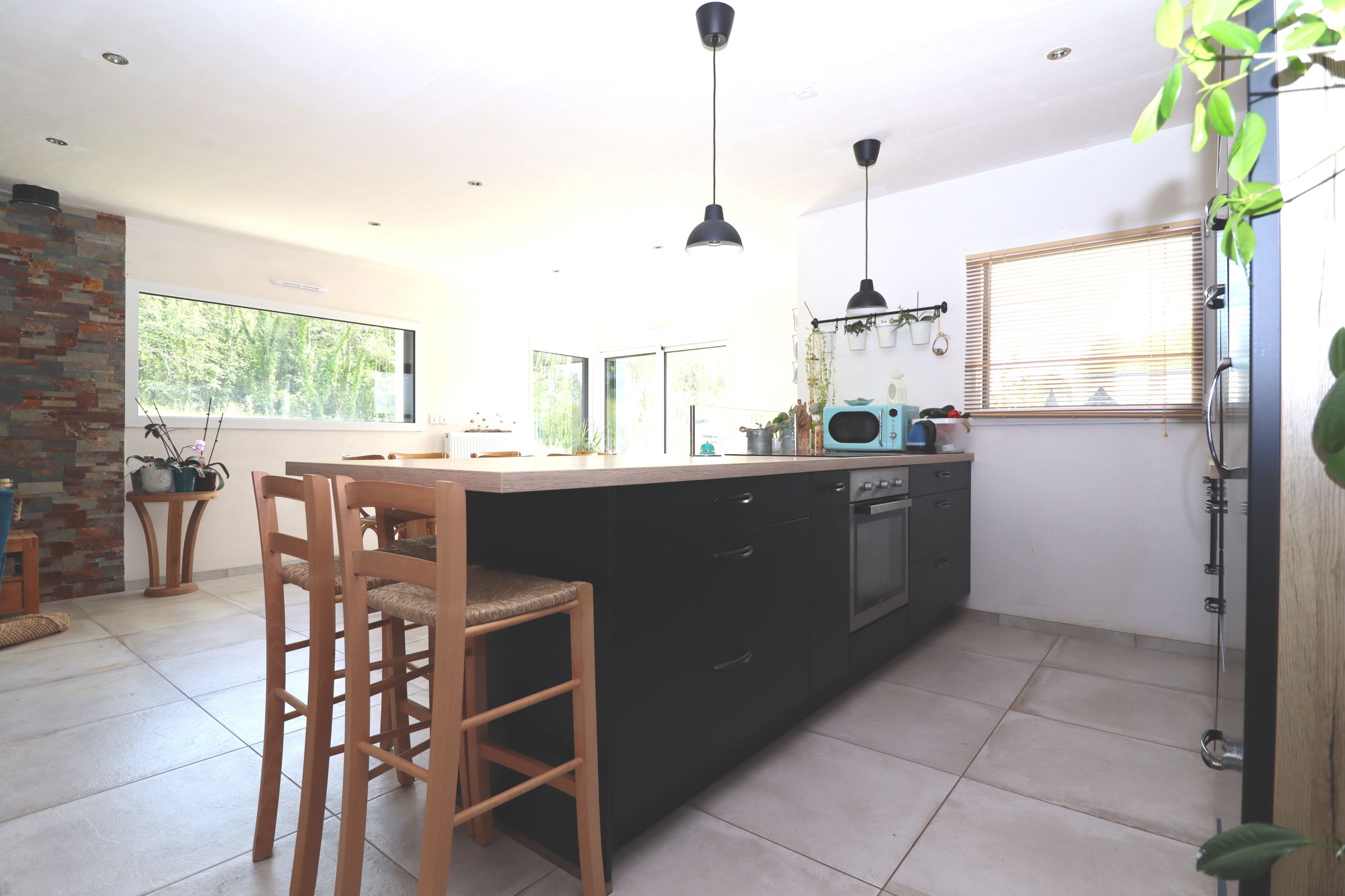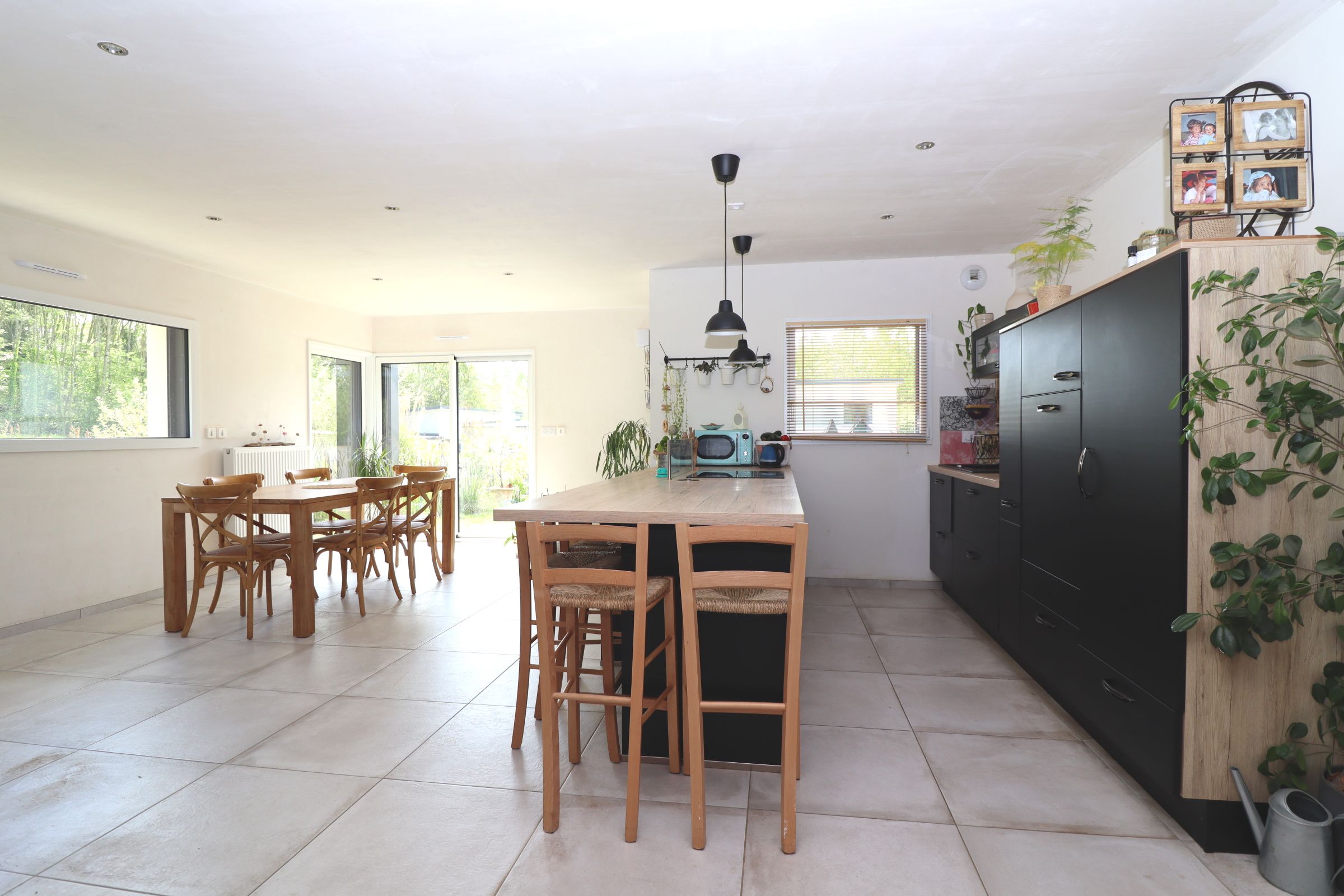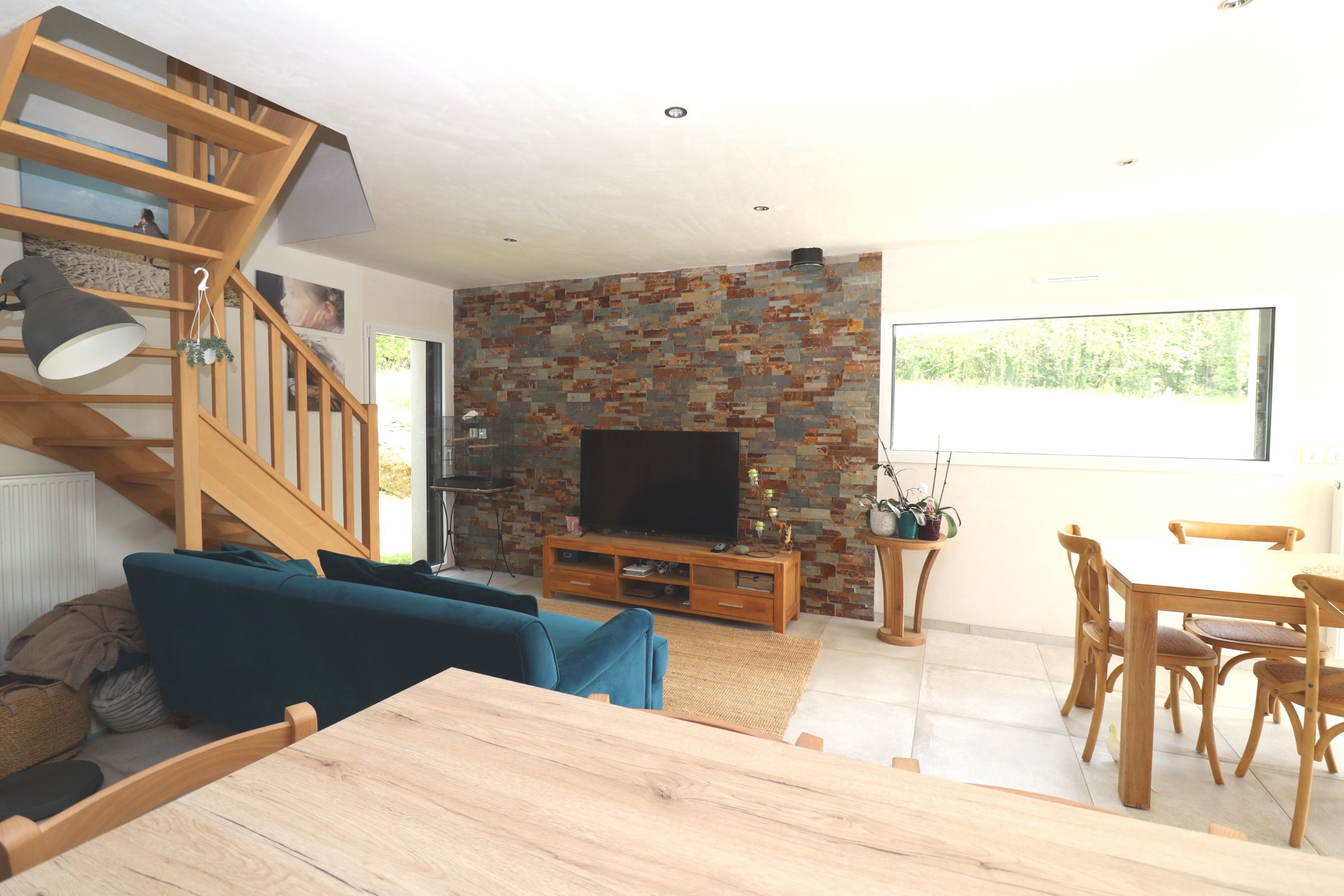 Au rez-de-chaussée la maison comprend une grande pièce de vie de 43m2 sans vis à vis orientée sud-ouest avec cuisine ouverte équipée et aménagée, une suite parentale de 16m2 avec dressing, salle de douche et WC, un cellier avec accès direct à un Atelier/Garage de 15m2. Un WC séparé complète le RDC.