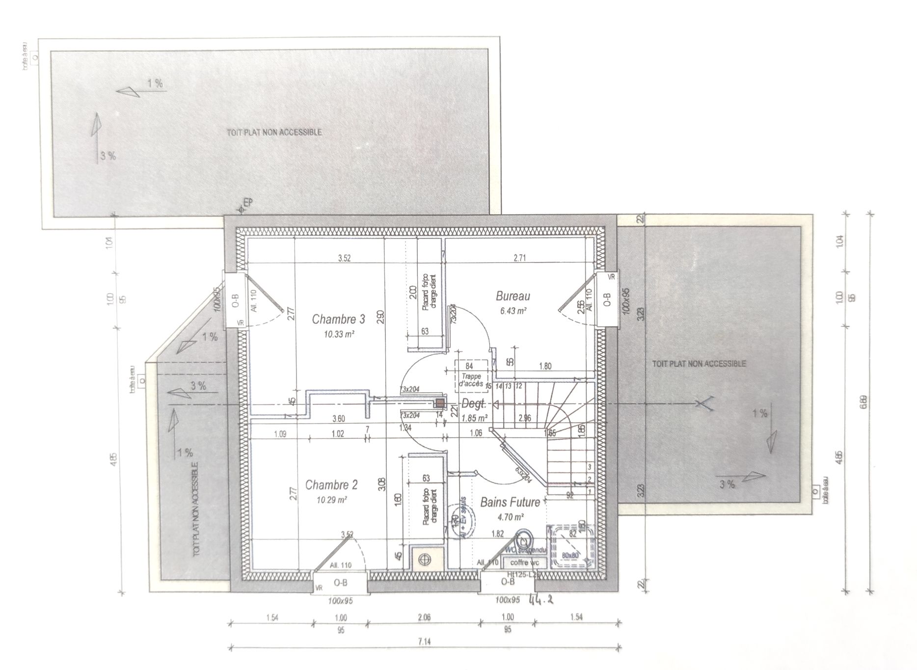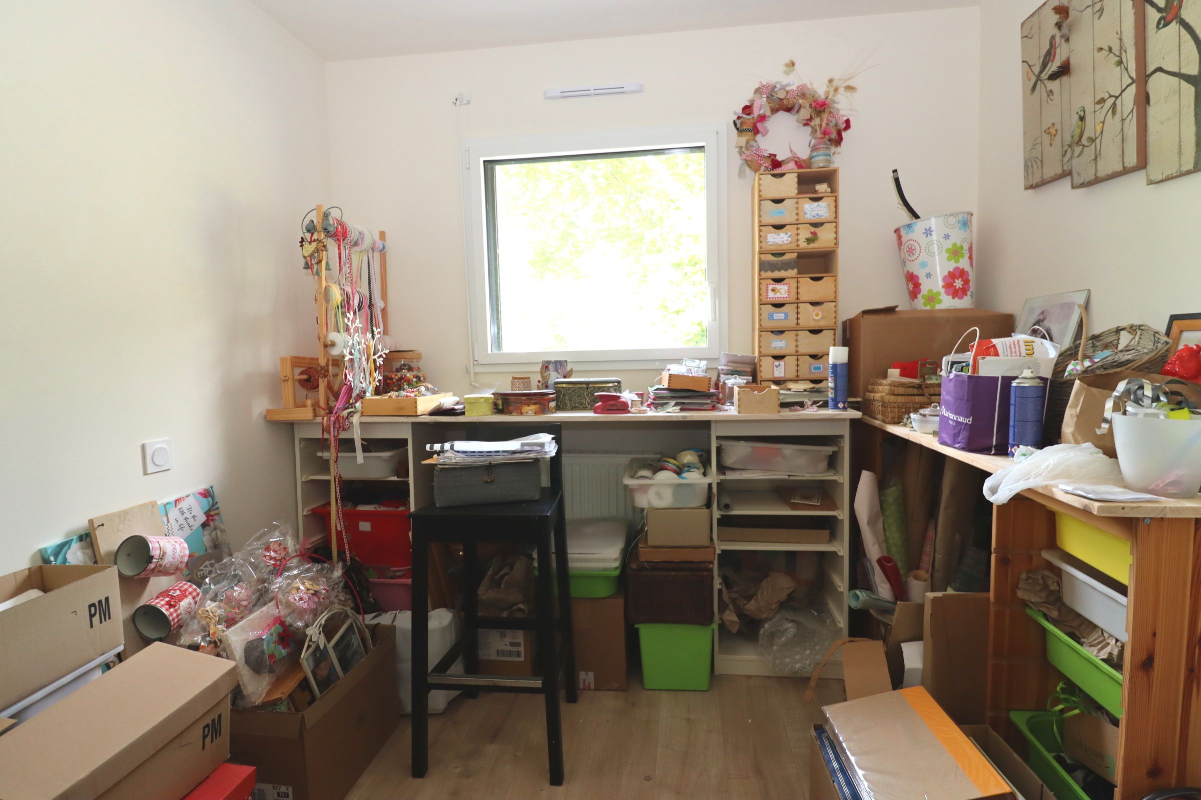 A l'étage, un palier dessert 2 chambres de 10m2, un bureau de 7m2 et une salle de douche avec WC.
