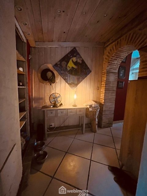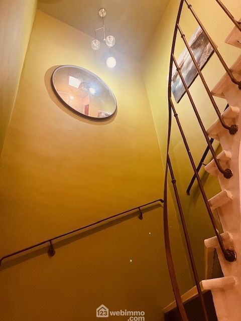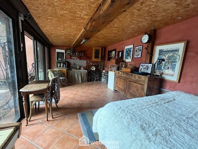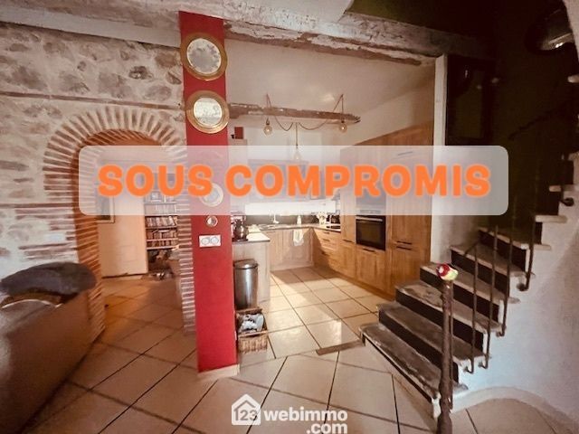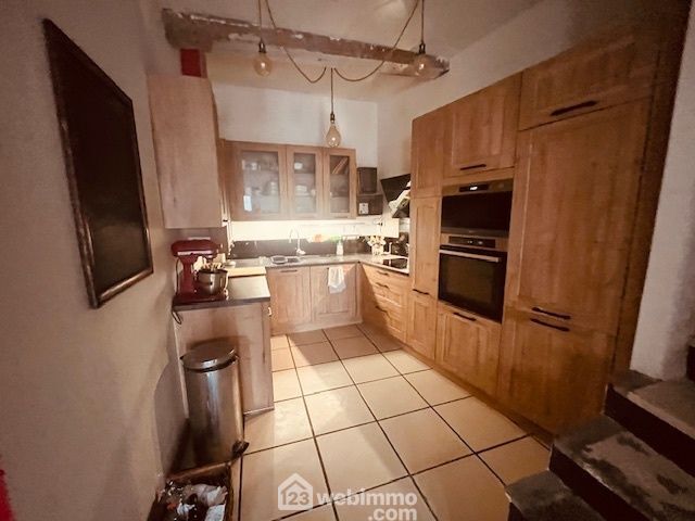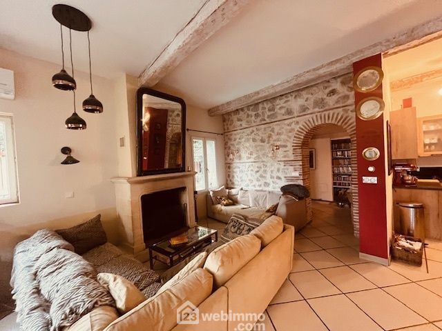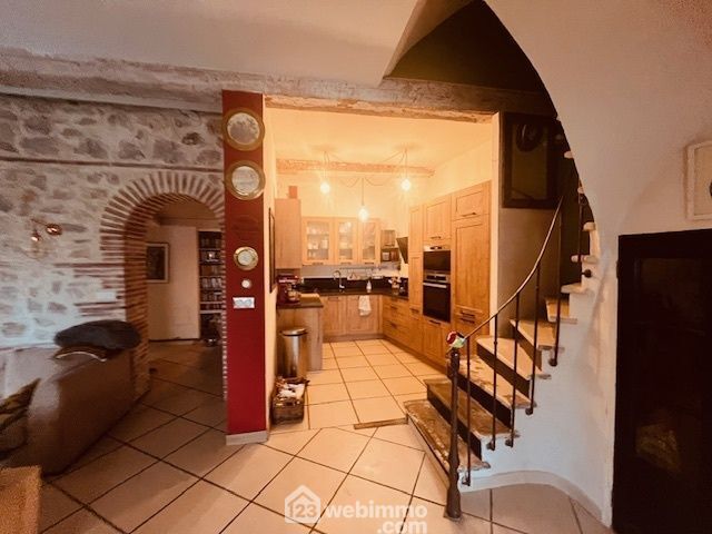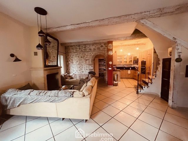 Lumineuse pièce de vie pleine d'authenticité avec ces murs en pierres et sa cheminée prolongé par une cuisine équipée aménagée....