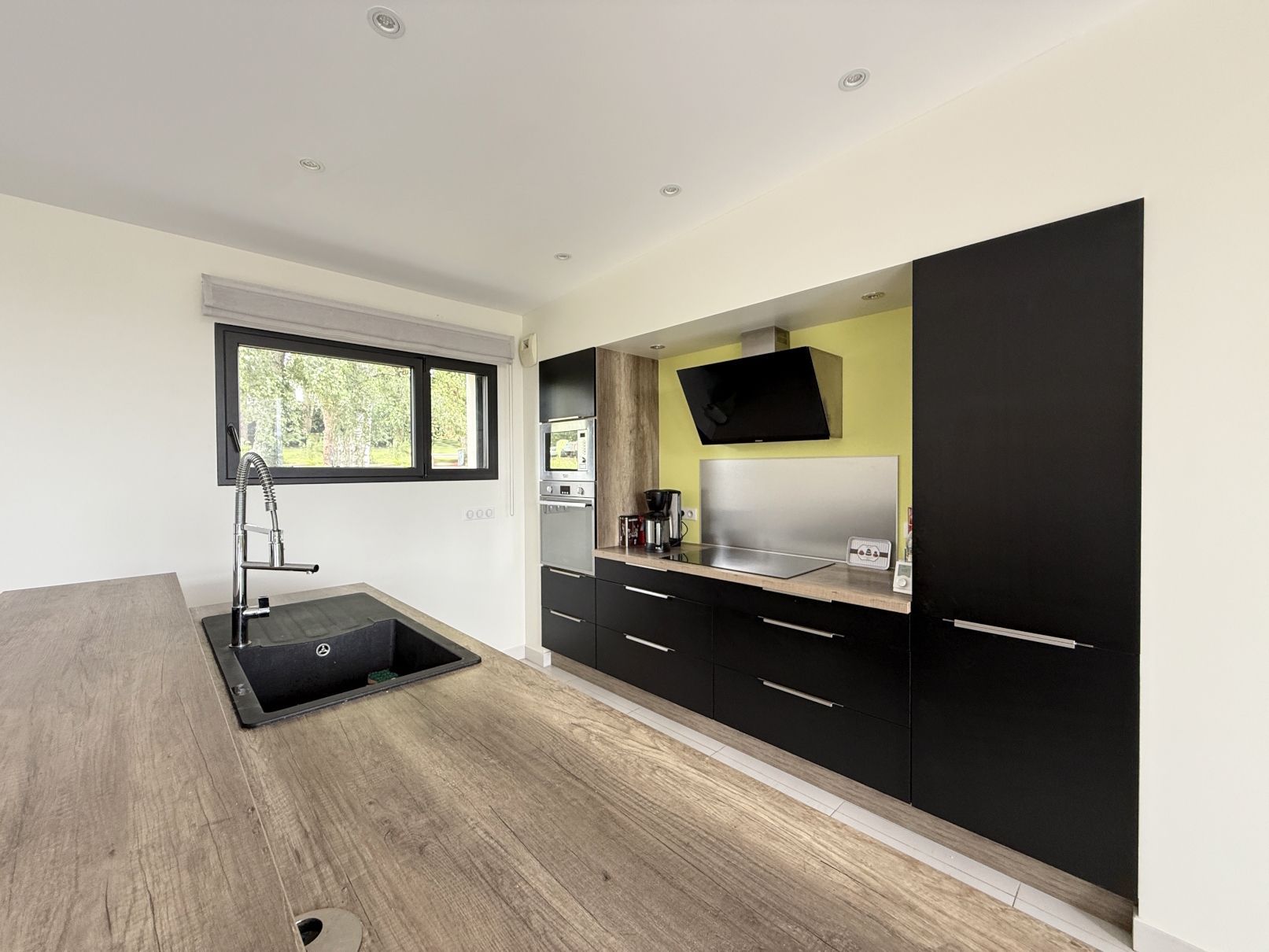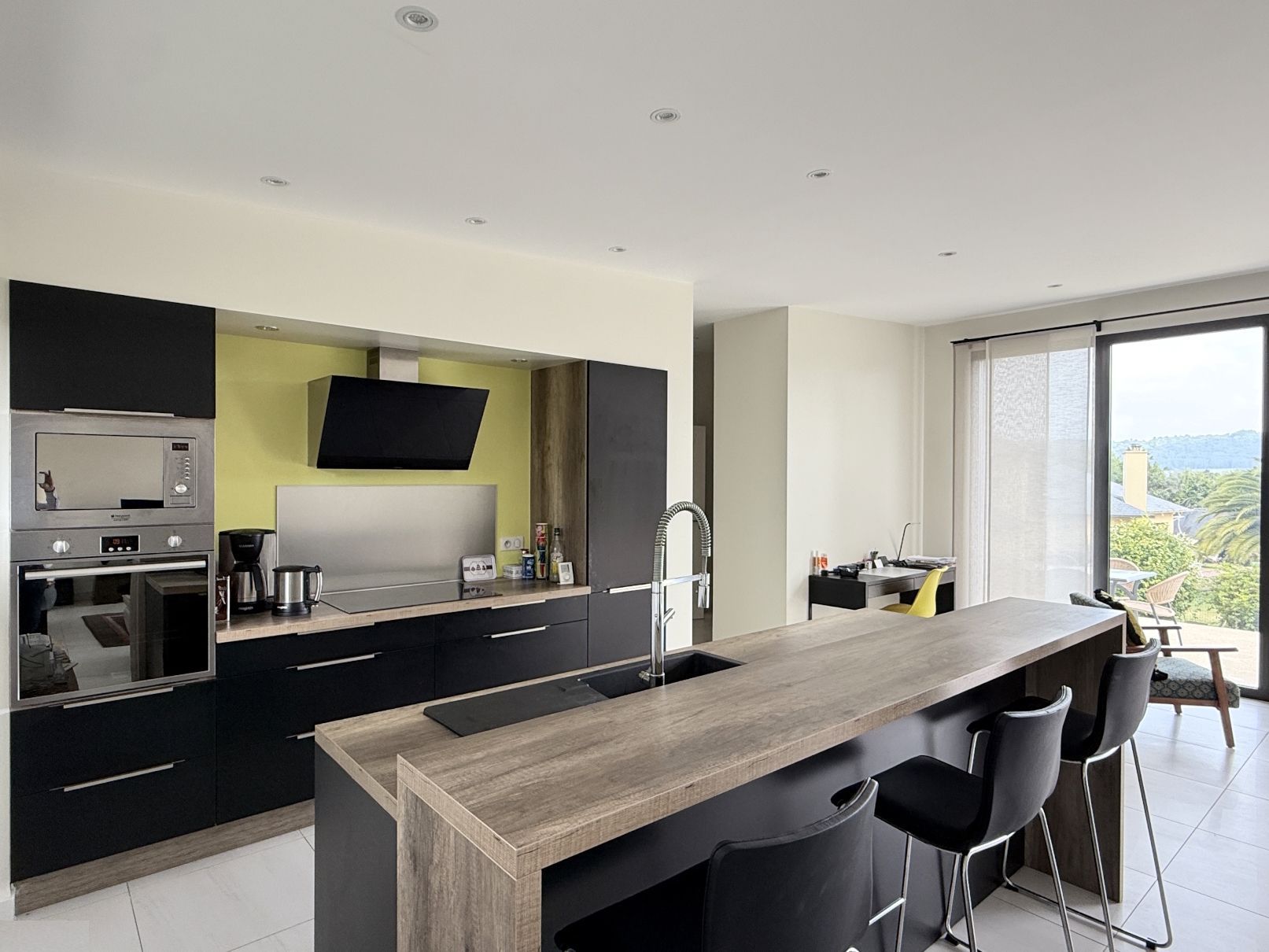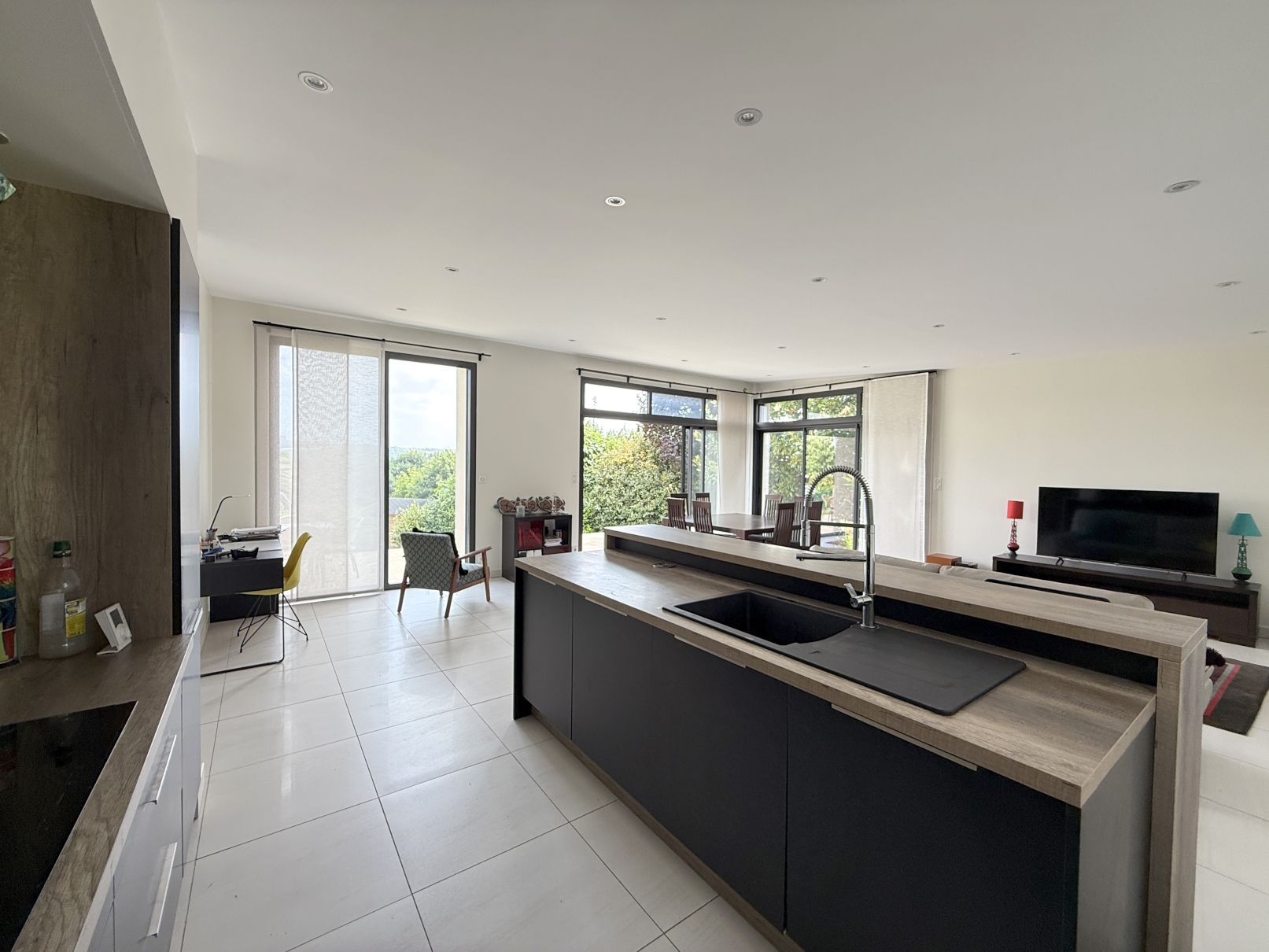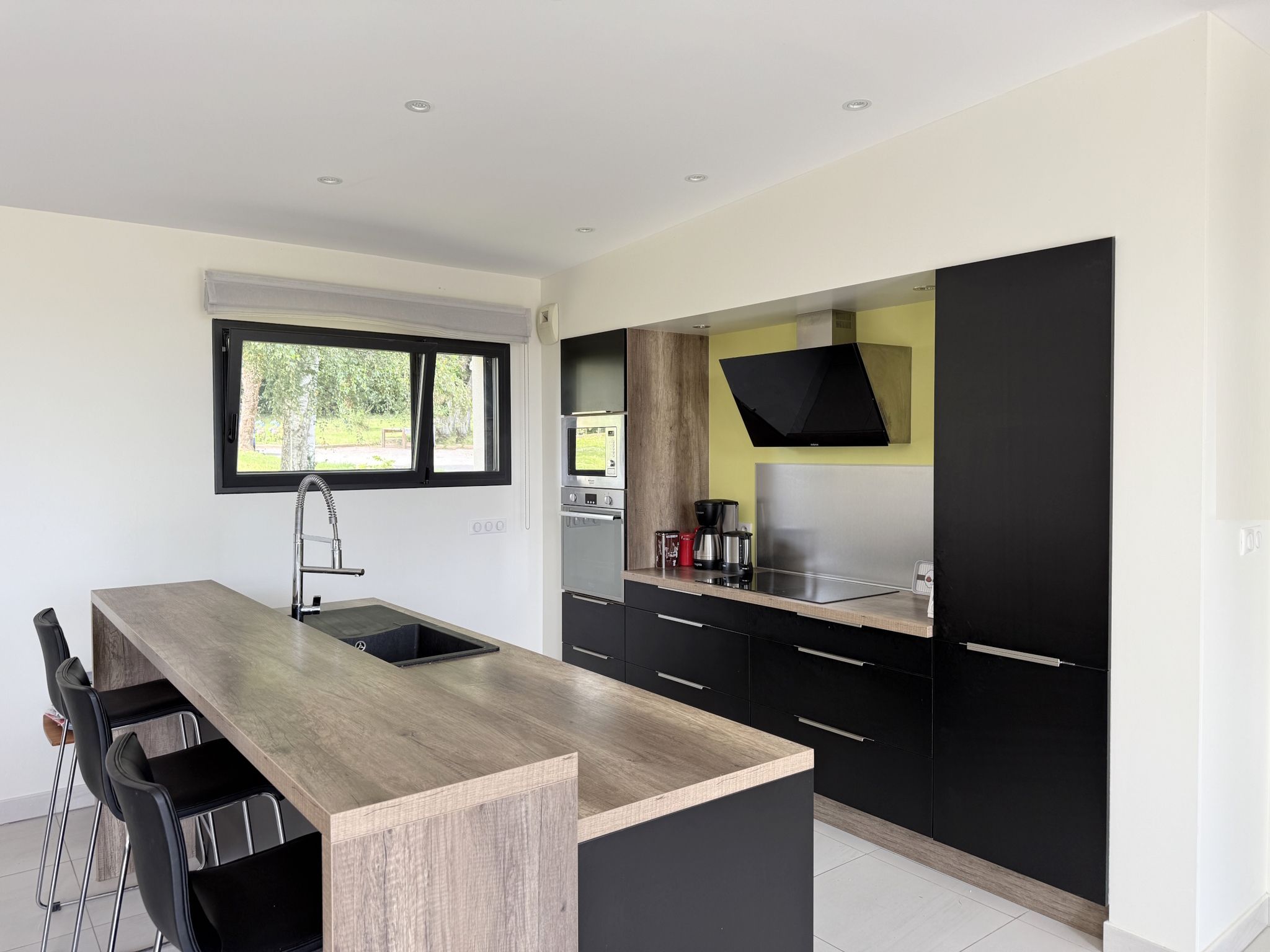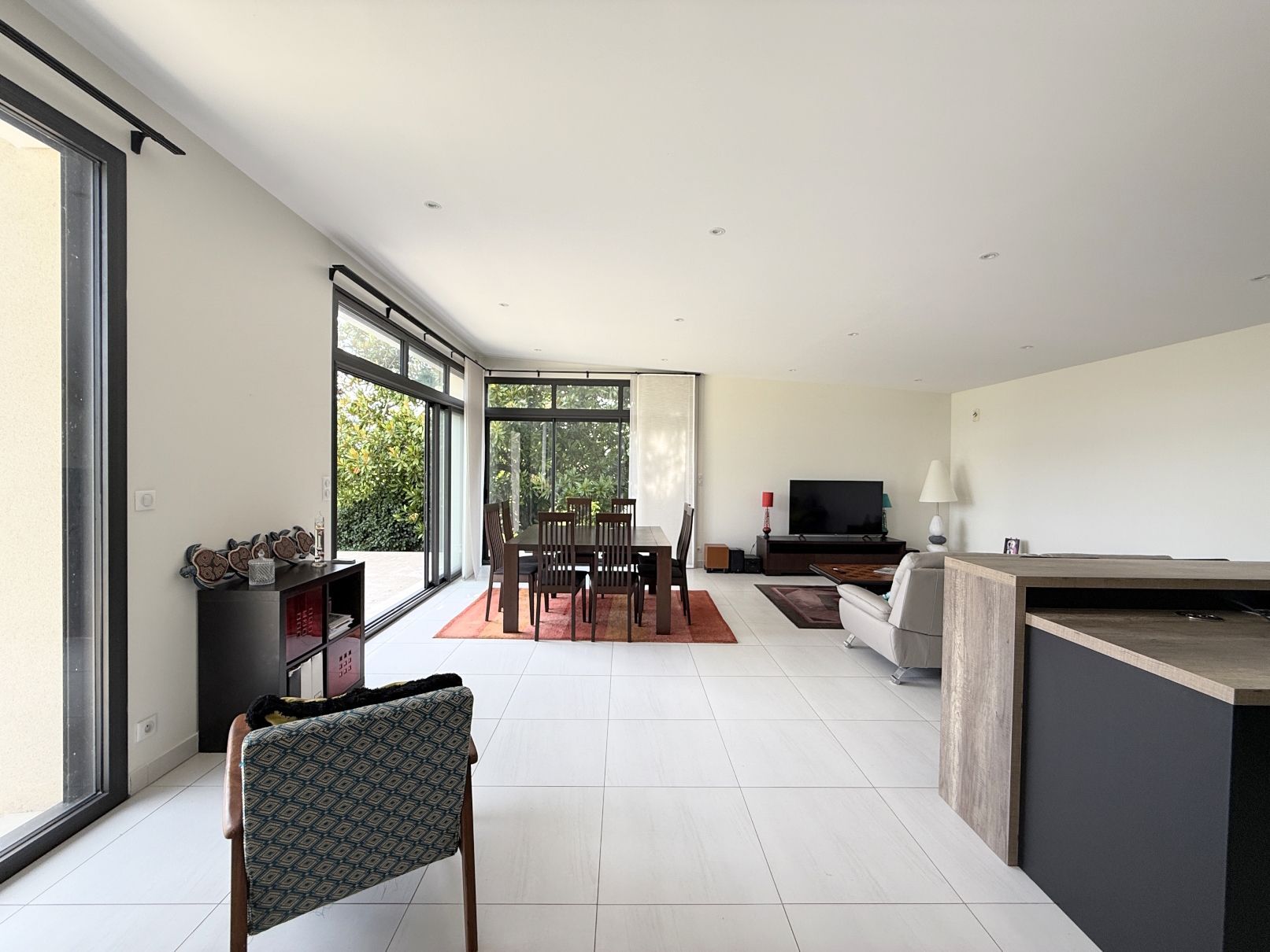 Avec 137 m² habitables et un agencement fluide, la maison offre un véritable confort de vie, en grande partie de plain-pied. Dès l’entrée, on ressent cette luminosité omniprésente, accentuée par une belle hauteur sous plafond et une double orientation sud et ouest. Le séjour, spacieux et chaleureux de 56m2, intègre une cuisine ouverte avec îlot central, équipée Ariston, qui invite naturellement aux moments partagés.