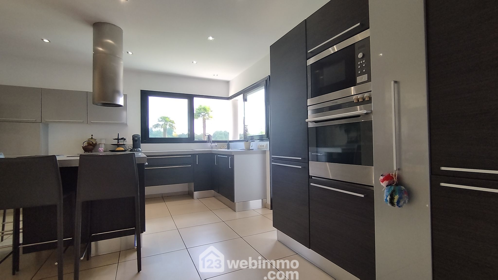 À l’Ouest, vous trouverez un bureau pouvant faire office de cinquième chambre, une suite parentale, une salle d’eau et des toilettes. L’espace de vie principal, orienté Sud-Est, comprend un séjour équipé d’un poêle à bois, une salle à manger et une cuisine donnant accès à une grande terrasse, avec une vue dégagée sur la piscine et le jardin paysager.
