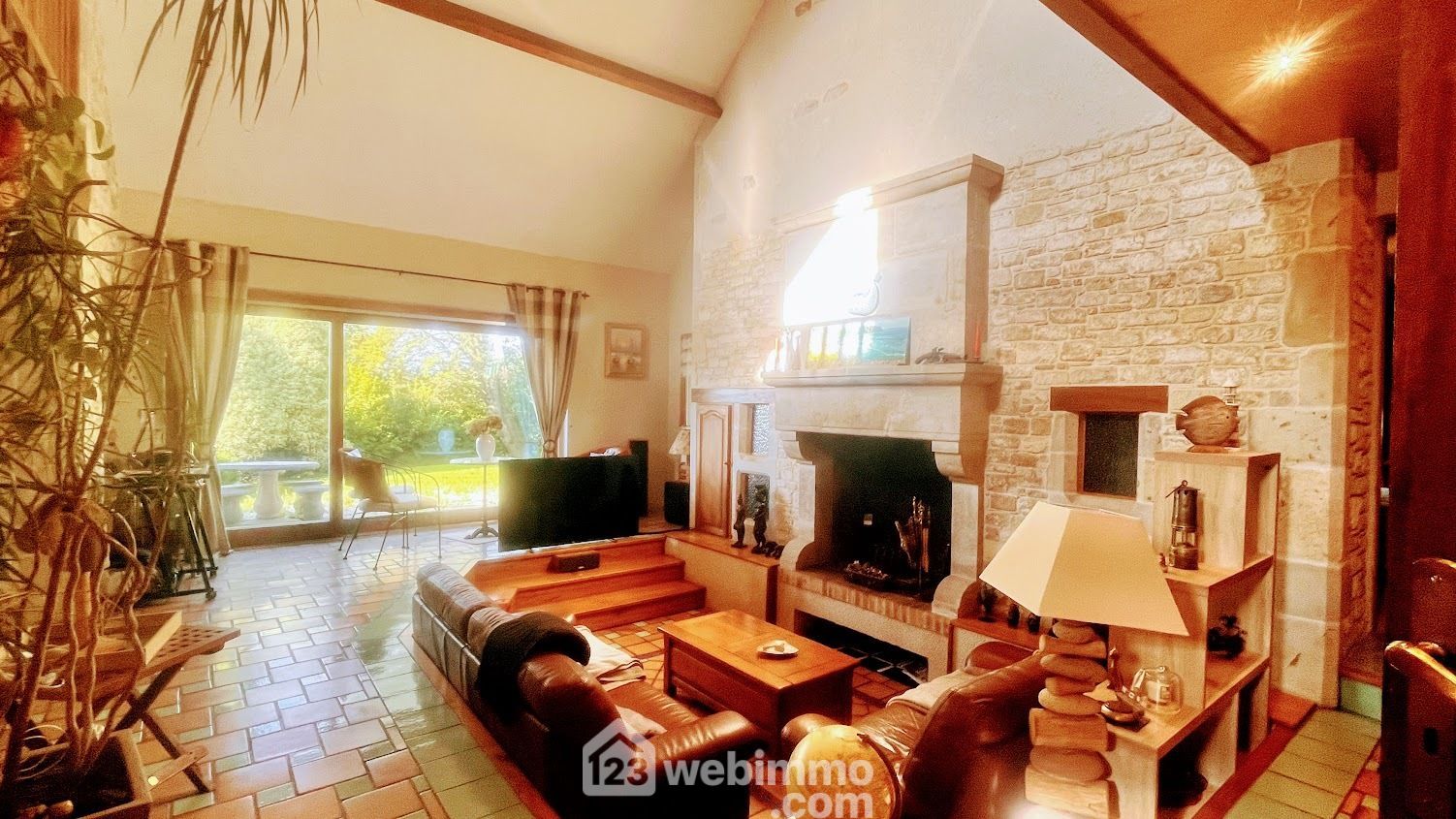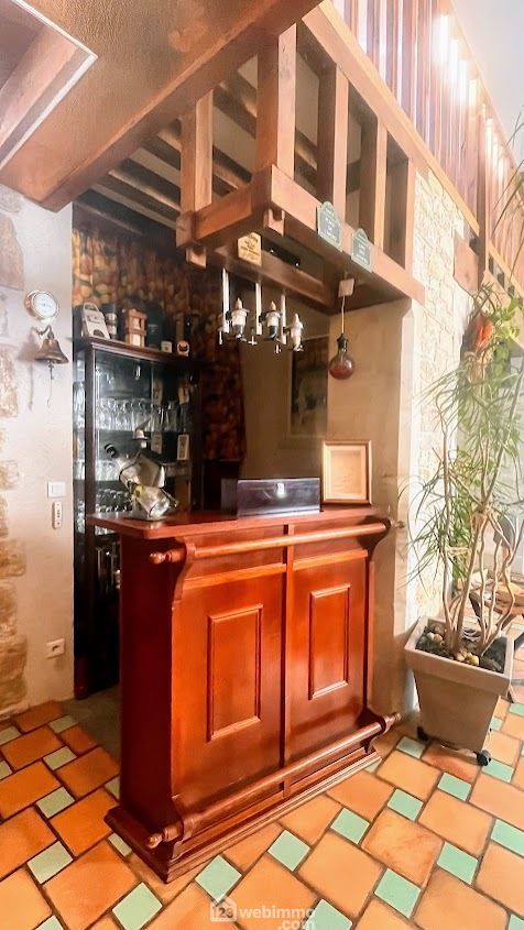 D'un côté, l'espace salon avec sa cheminée en pierre style Louis XIII et son coin aménagé en bar.