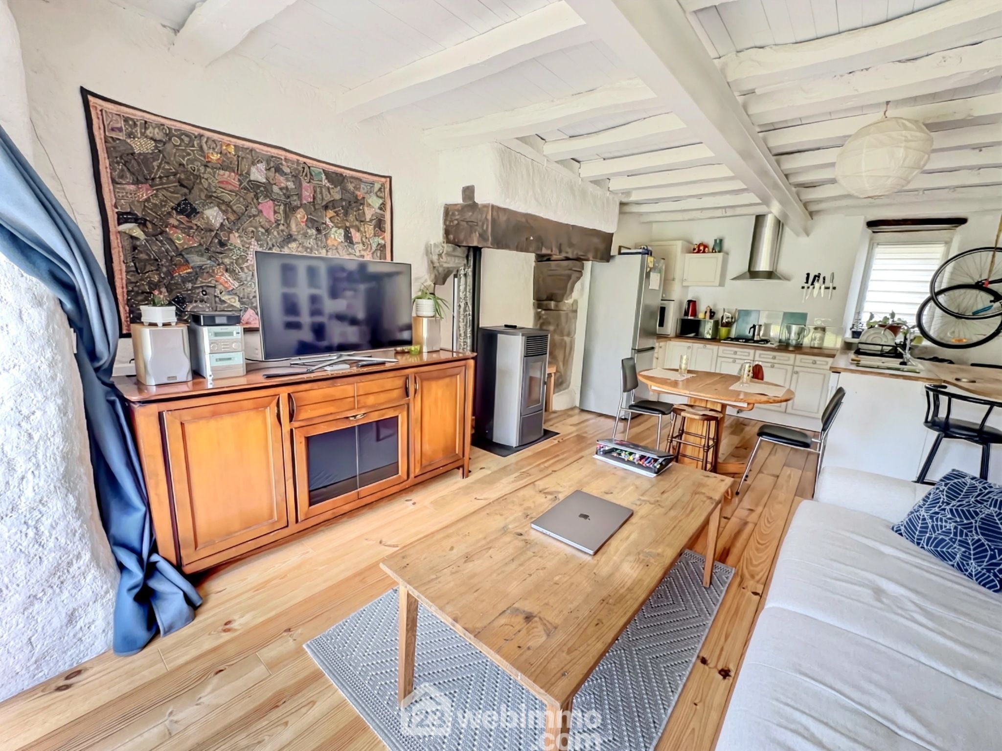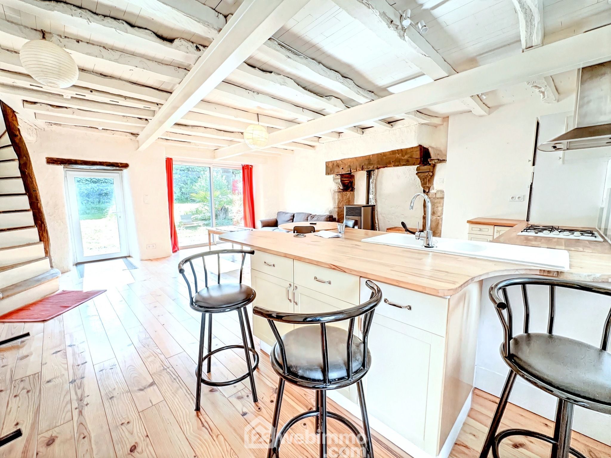Dès l’entrée, le charme opère : poutres apparentes, parquet en pin, cheminée en pierre, et une belle lumière traversante qui rend le salon accueillant toute l’année. La cuisine ouverte, moderne et équipée, prolonge l’ambiance conviviale : un espace pensé pour cuisiner, recevoir, partager.