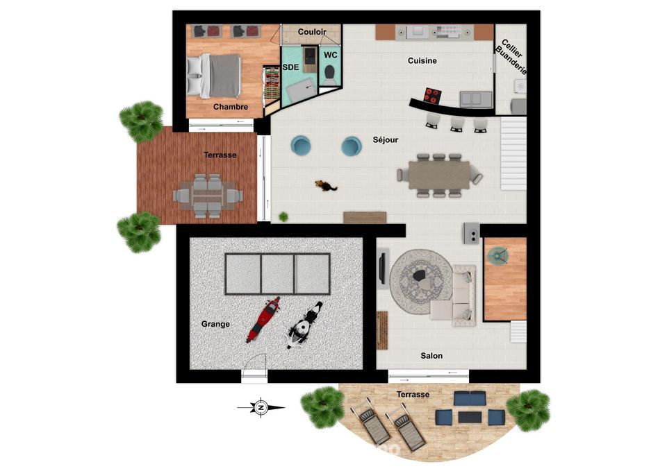 Au-delà d'une terrasse couverte, entrée par la grande pièce de vie avec : un séjour lumineux de 38 m2, un salon cocooning de 27 m2 avec pierre apparente et poêle à bois (au-dessus une mezzanine), une cuisine ouverte aménagée et équipée contemporaine, un cellier/buanderie, une chambre parentale, une salle d'eau et un WC.