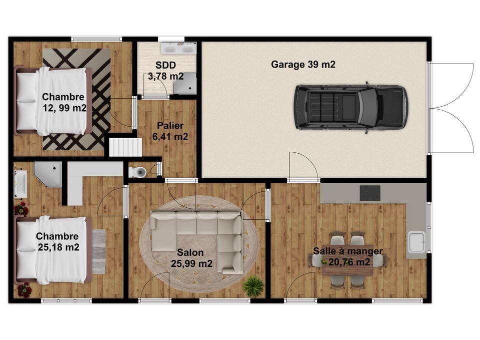 Au rez-de-chaussée : salon de 26 m2, cuisine salle à manger de 21 m2, dégagement, chambre de 13 m2, salle d'eau, WC et pièce supplémentaire de 25 m2 à aménager selon vos envies en suite parentale, bureau ou autre.