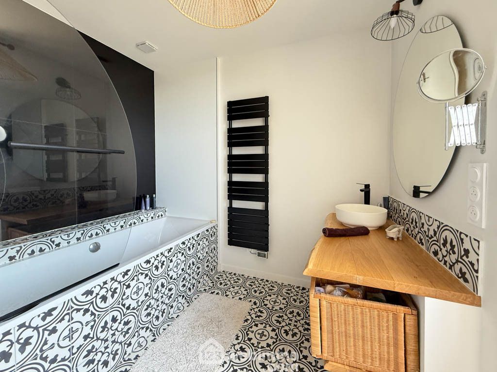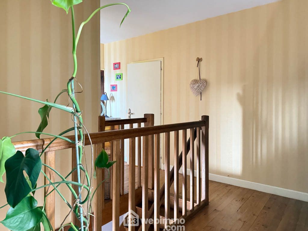 La maison propose au rez-de-chaussée une entrée, une cuisine aménagée et équipée, un vaste séjour-salon avec poêle à bois (2023), un bureau, une buanderie avec douche, des WC séparés et une cave. À l’étage, le palier dessert quatre chambres dont une avec salle d’eau, une salle de bain entièrement rénovée (2024) et des WC. Les combles aménagés complètent l’ensemble avec deux chambres supplémentaires et une salle d’eau avec WC.