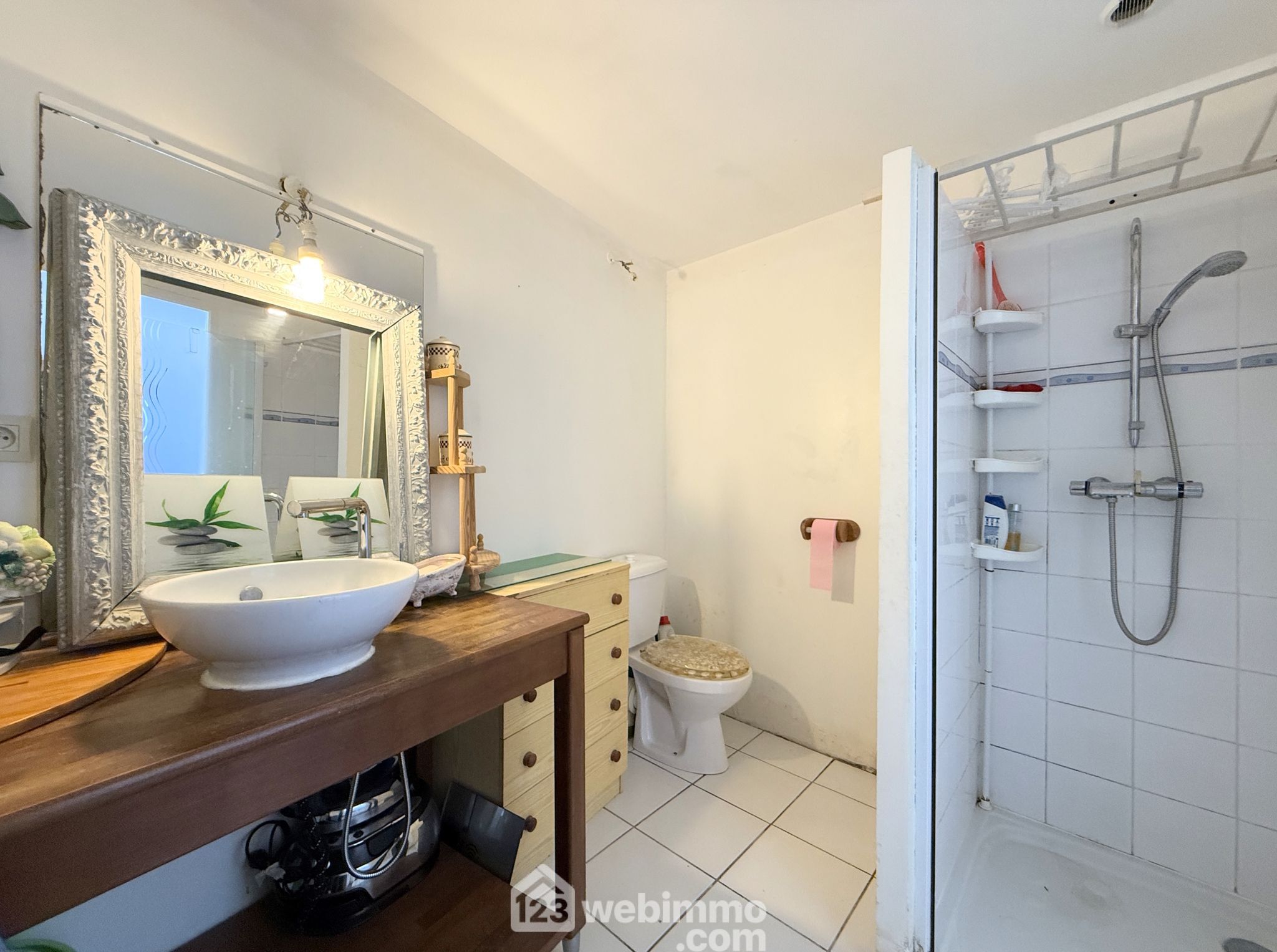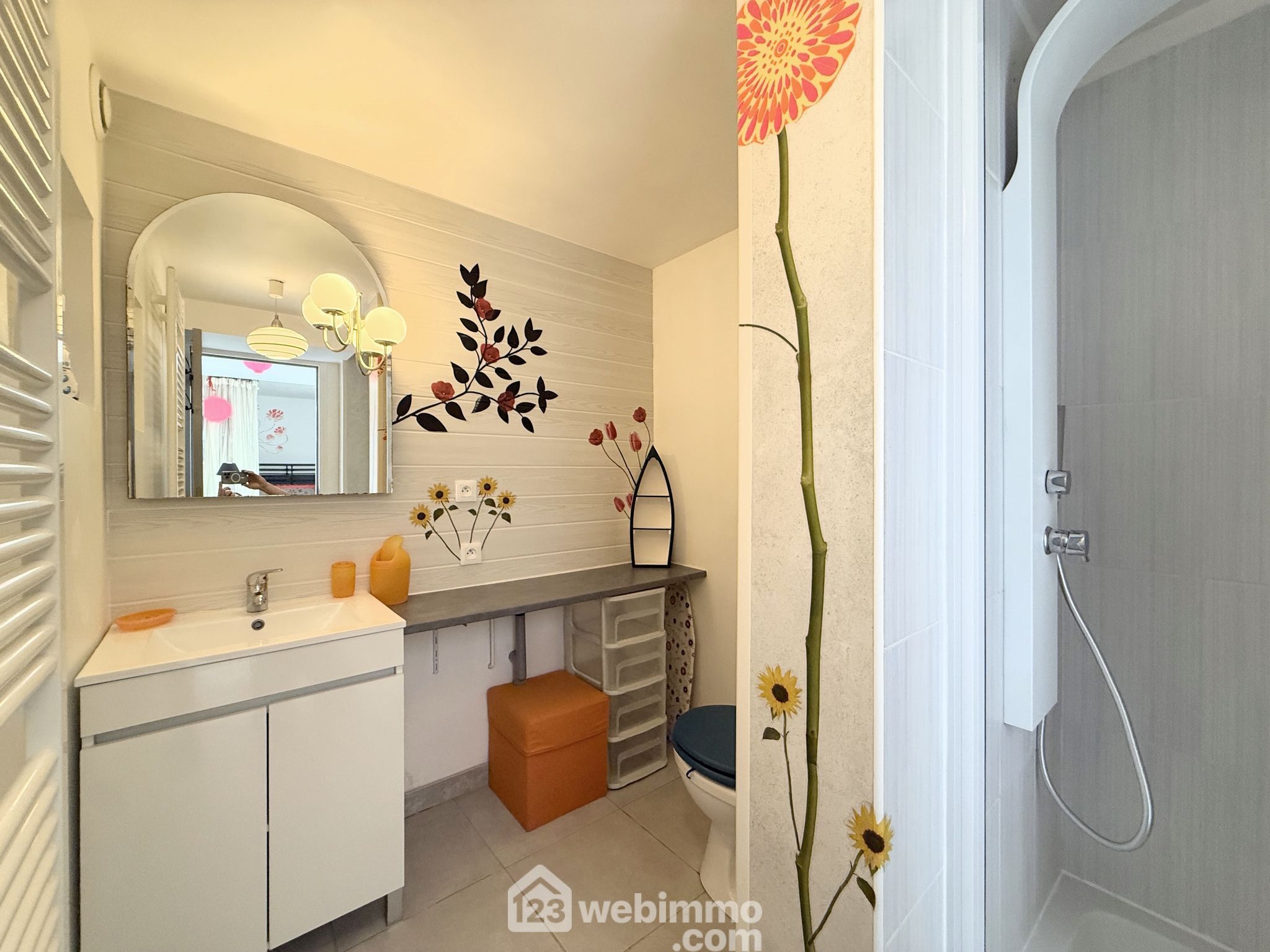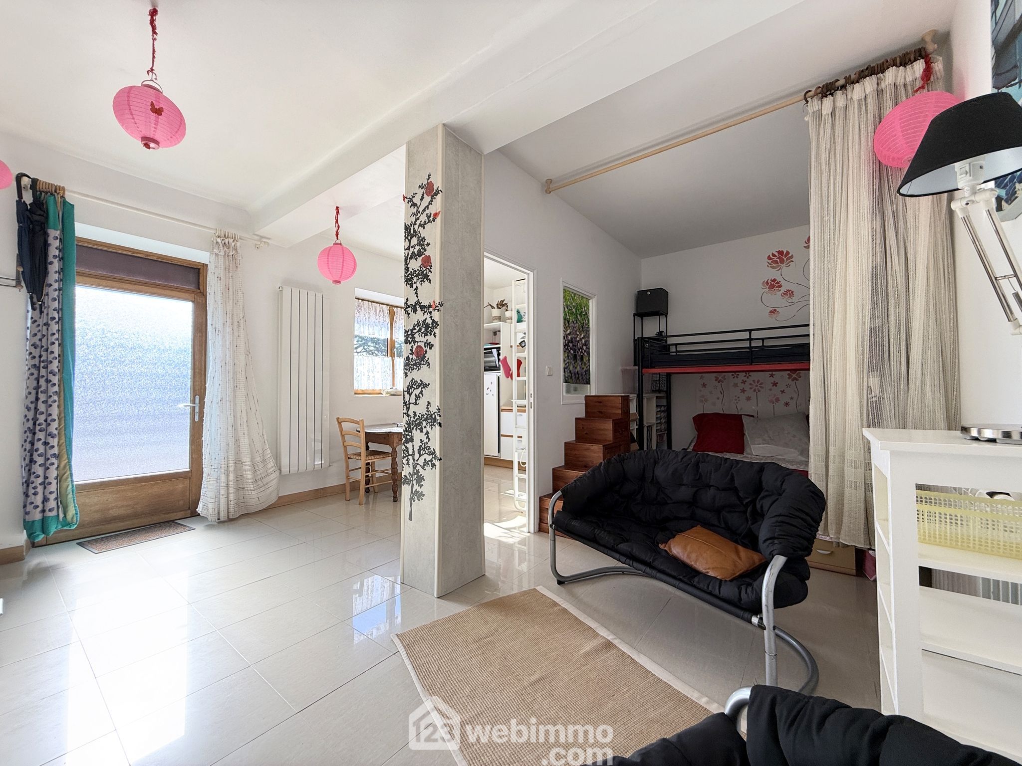 Au rez-de-chaussée, l'appartement de type T2 de 42 m², s'ouvre sur une belle pièce de vie de 28m2 renfermant une cuisine ouverte et un espace salon, une chambre de 10m2 et une salle de douche avec WC de 4m2. Sa configuration actuelle lui permet d'accueillir jusqu’à 5 personnes en location estivale.