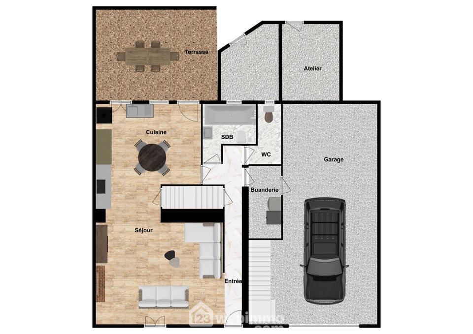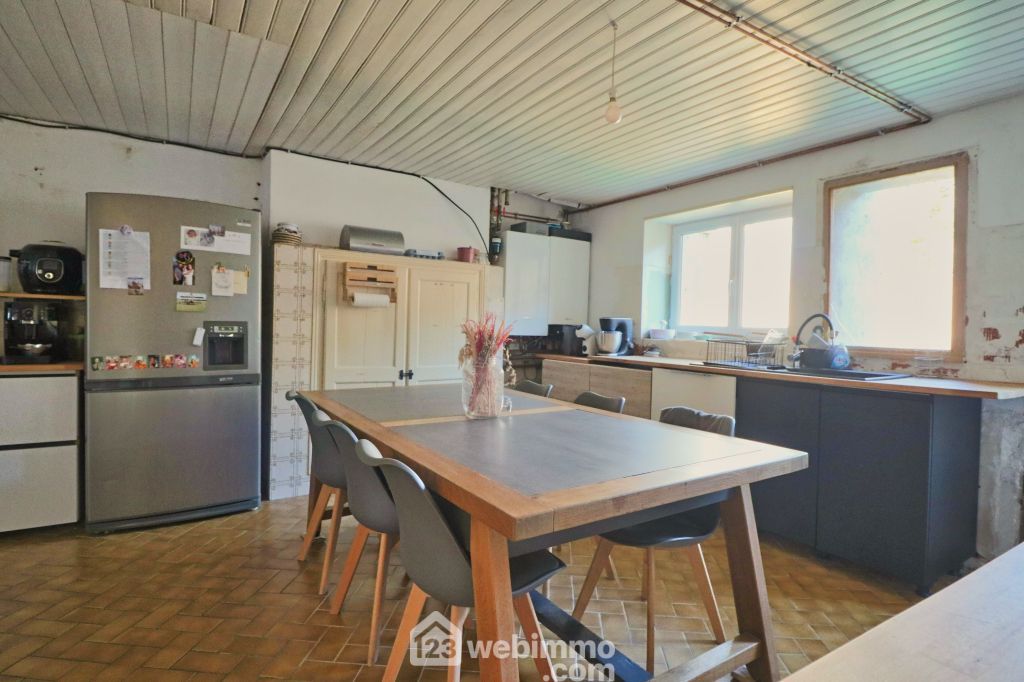 Au rez-de-chaussée : entrée, séjour de 30 m2 avec cheminée ouverte, cuisine aménagée de 15 m2, salle de bains à rafraîchir, WC, buanderie.