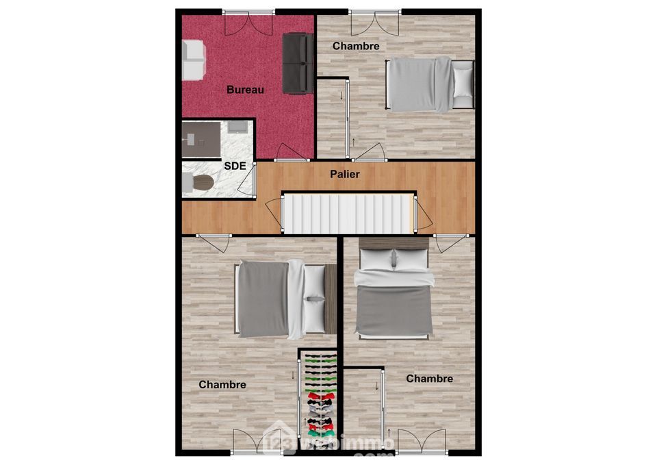 A l'étage : palier, 3 chambres de 9 à 15 m2, 1 bureau (transformable en dressing ouvert), 1 salle d'eau.