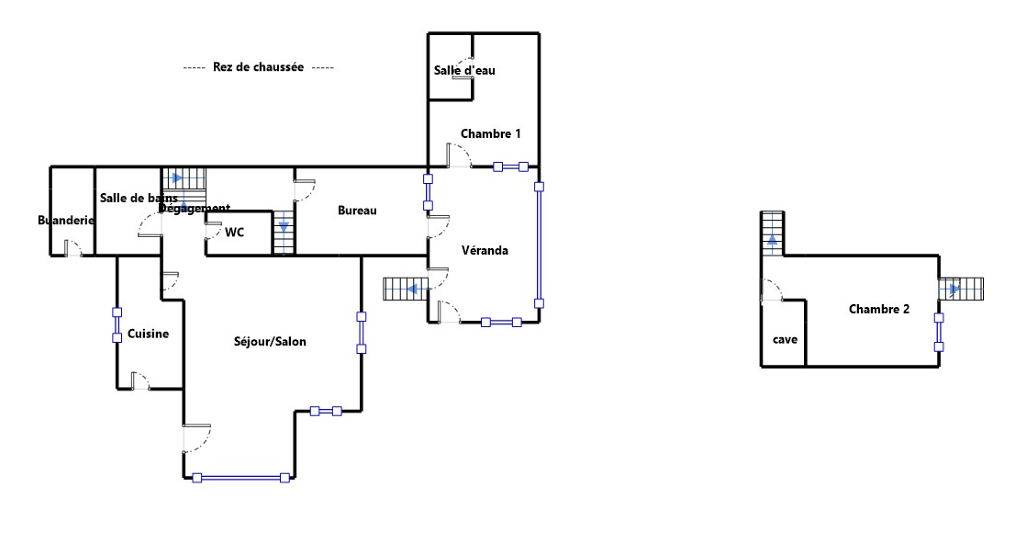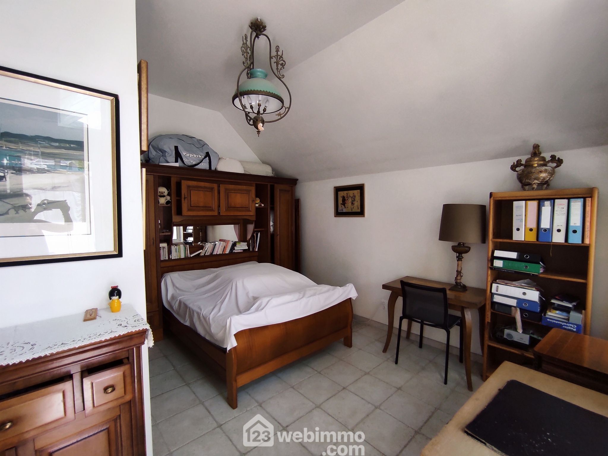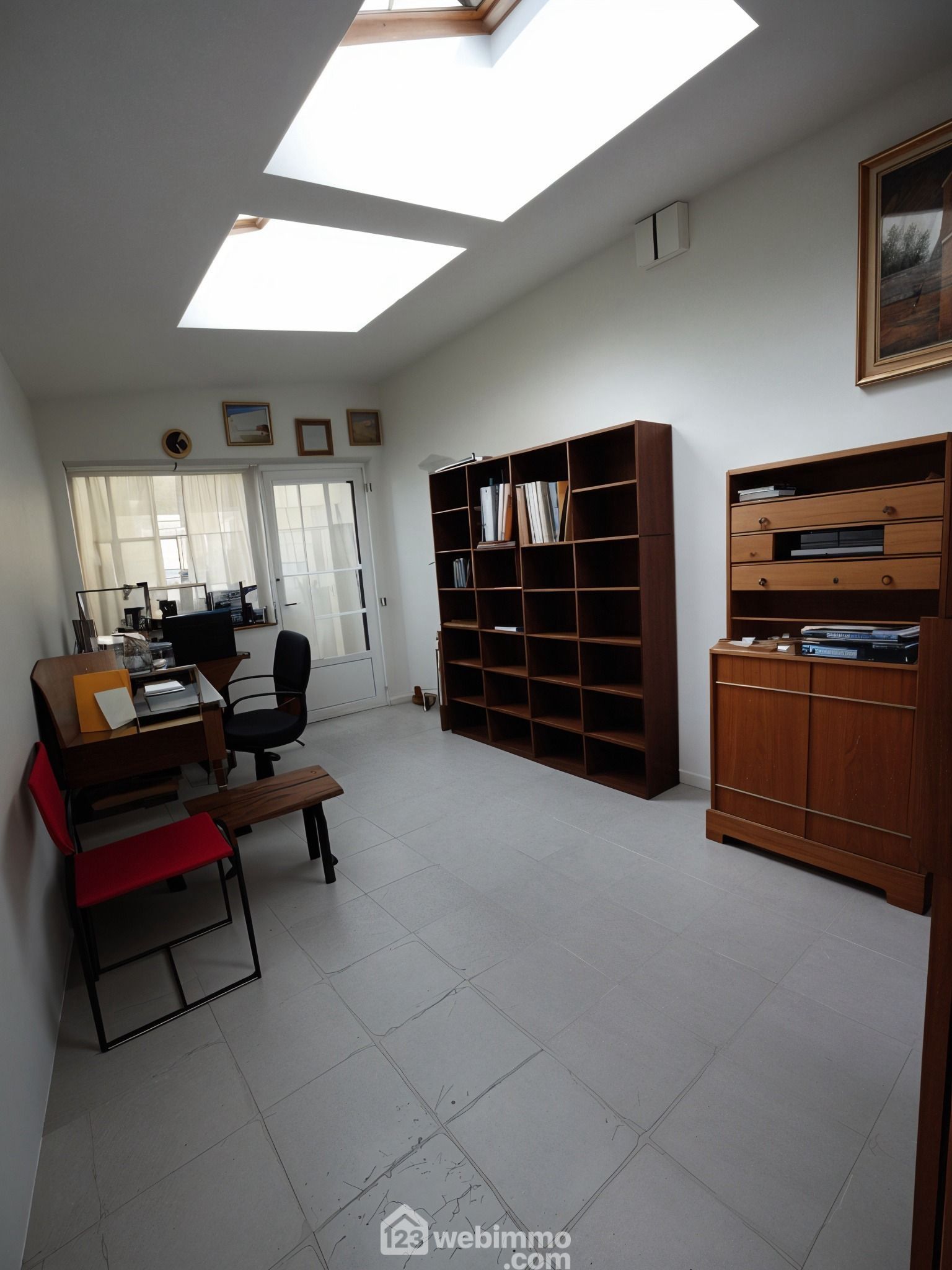 En demi-niveau : deux chambres, une pièce traversante actuellement à usage de bureau, véranda, cellier.