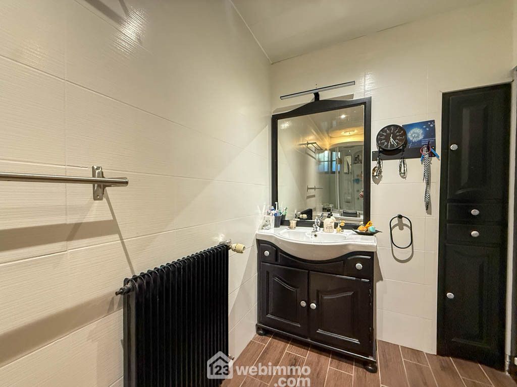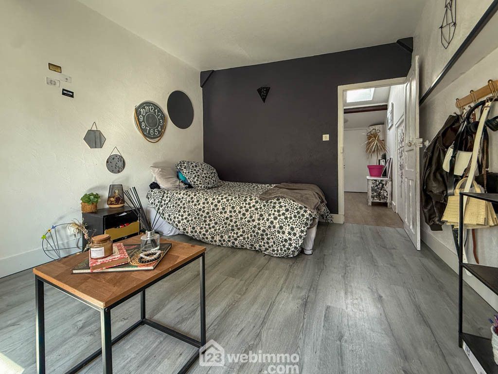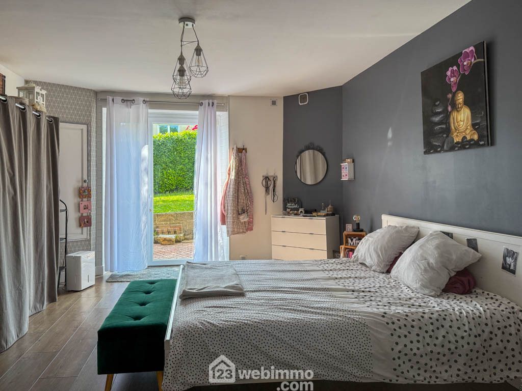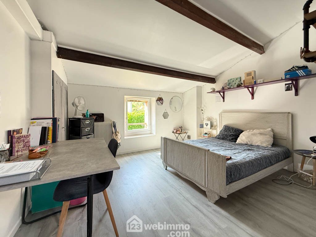 Dès l’entrée, un couloir dessert les différents espaces du rez-de-chaussée. Sur la gauche, une première pièce avec point d’eau de 12 m², aujourd’hui dédiée à une activité professionnelle, offre un espace indépendant, idéal pour concilier vie privée et projet personnel. Le couloir mène ensuite vers un bureau de 8 m², une salle de bain, des WC séparés, puis une chambre de plain-pied de 19 m² avec accès direct au jardin. En prolongement, on découvre un bel espace de vie traversant et chaleureux, composé d’un séjour-salon avec poêle à bois et d’une cuisine équipée ouverte sur la terrasse. Une arrière-cuisine, aménagée en buanderie, deux garages (portail motorisé) complètent ce niveau.