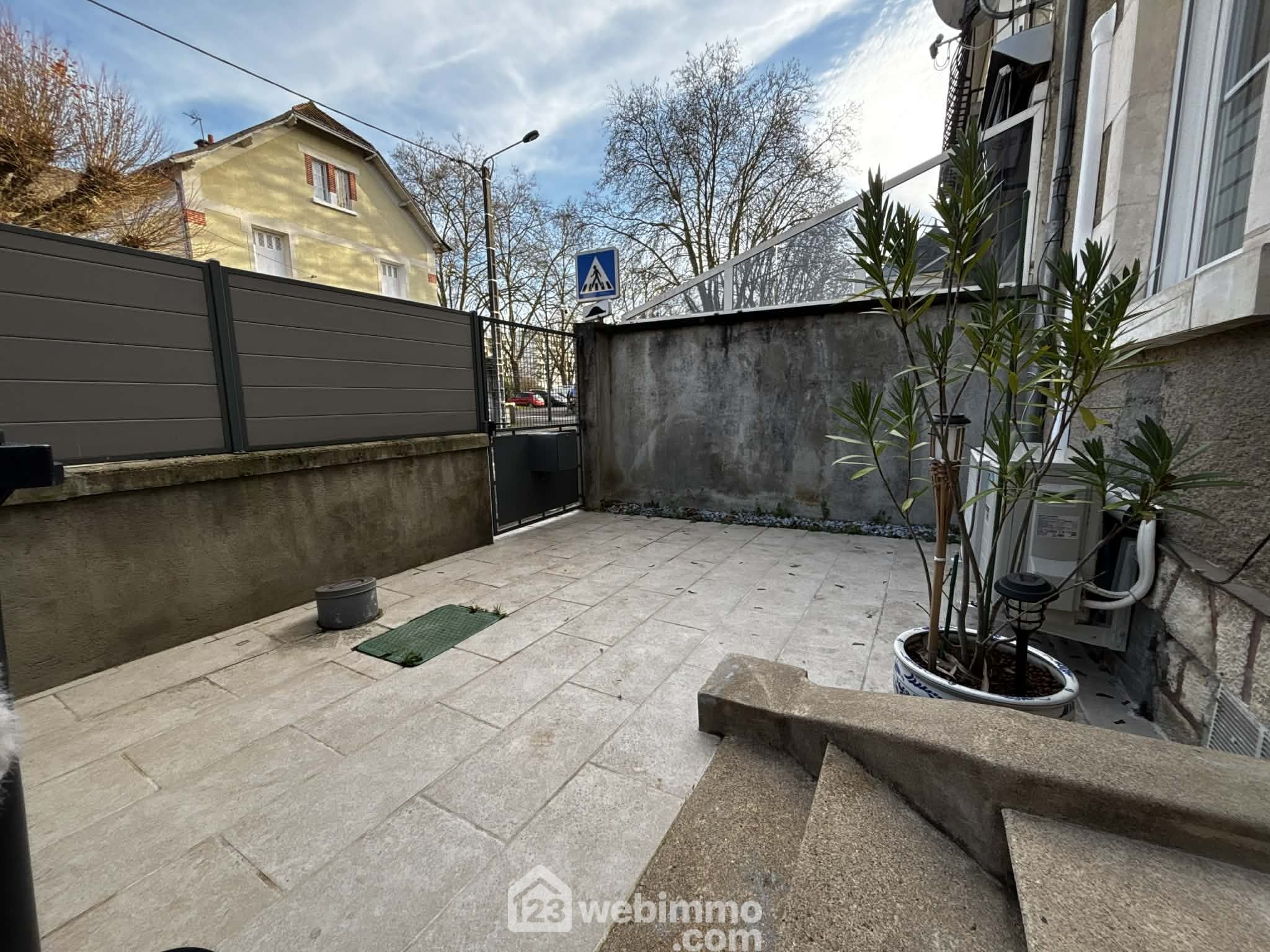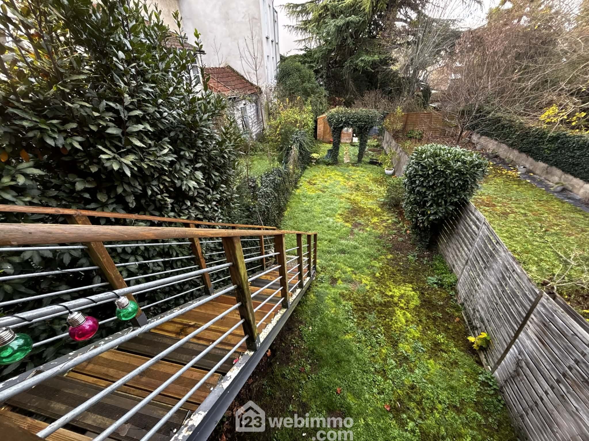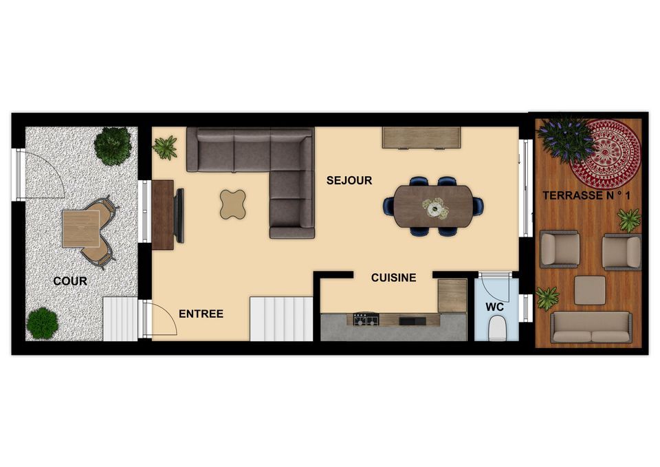Au-delà de la cour fermée, côté rue, entrée dans la pièce de vie avec la cuisine aménagée et équipée ouverte sur le séjour, un WC et, côté jardin, une terrasse surélevée en bois sans vis-à-vis.
