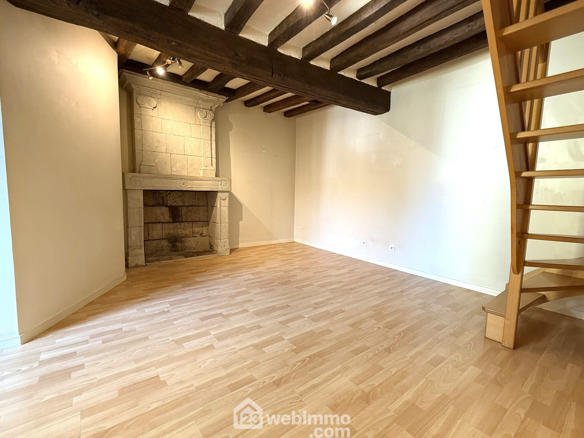 Au premier étage, on trouve une première pièce pouvant servir de salon ou de chambre avec une cheminée en tuffeau ainsi qu’une salle d’eau avec WC.