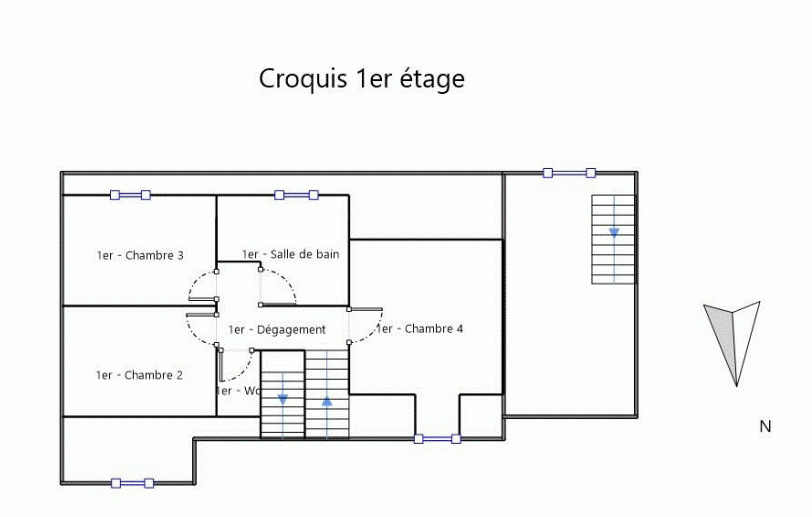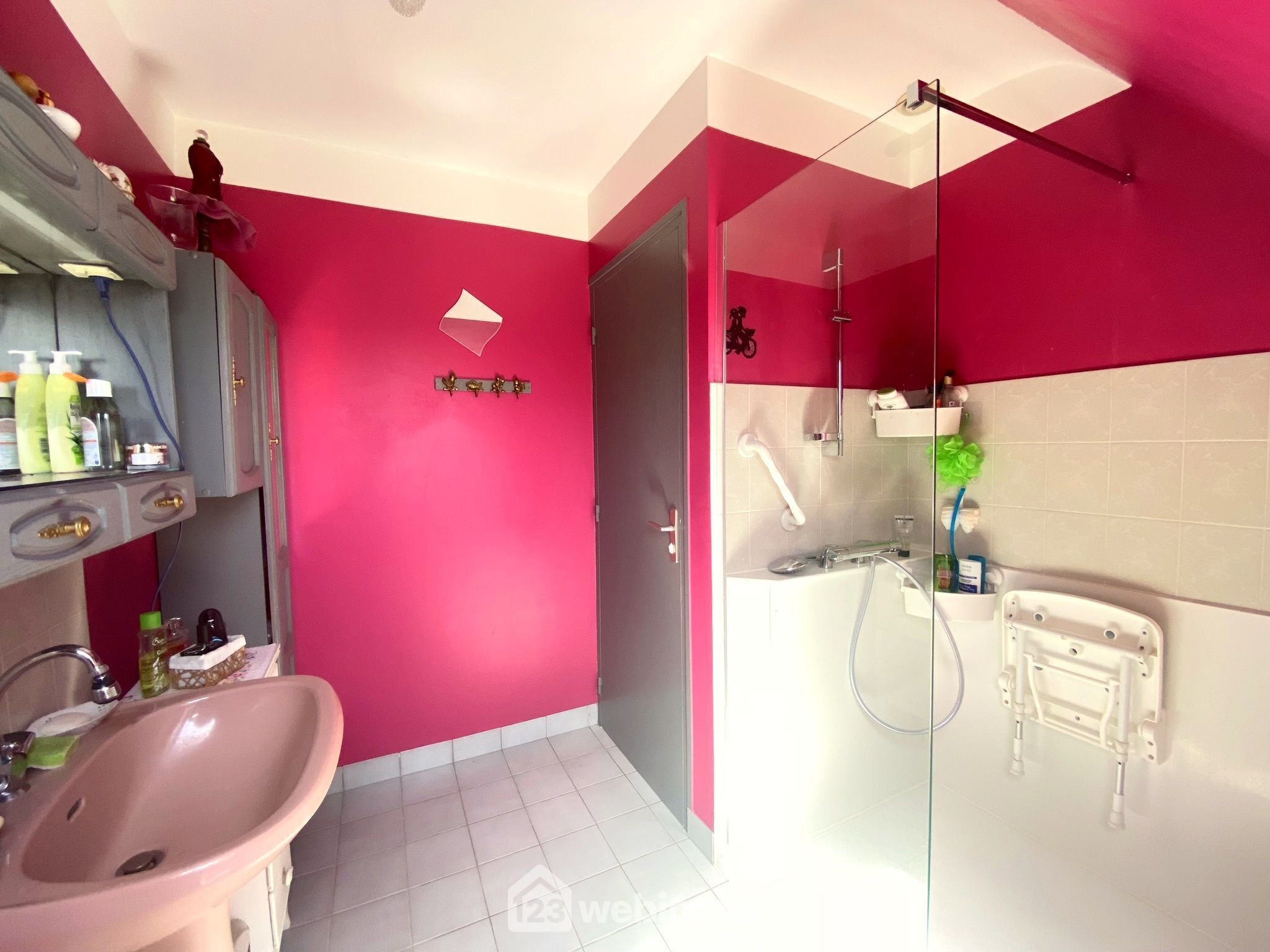 Au 1er étage, sur dalle béton, un palier de 3m2 dessert 3 chambres de 10 à 13m2 au sol, une salle de douche à l'italienne et un WC séparé.