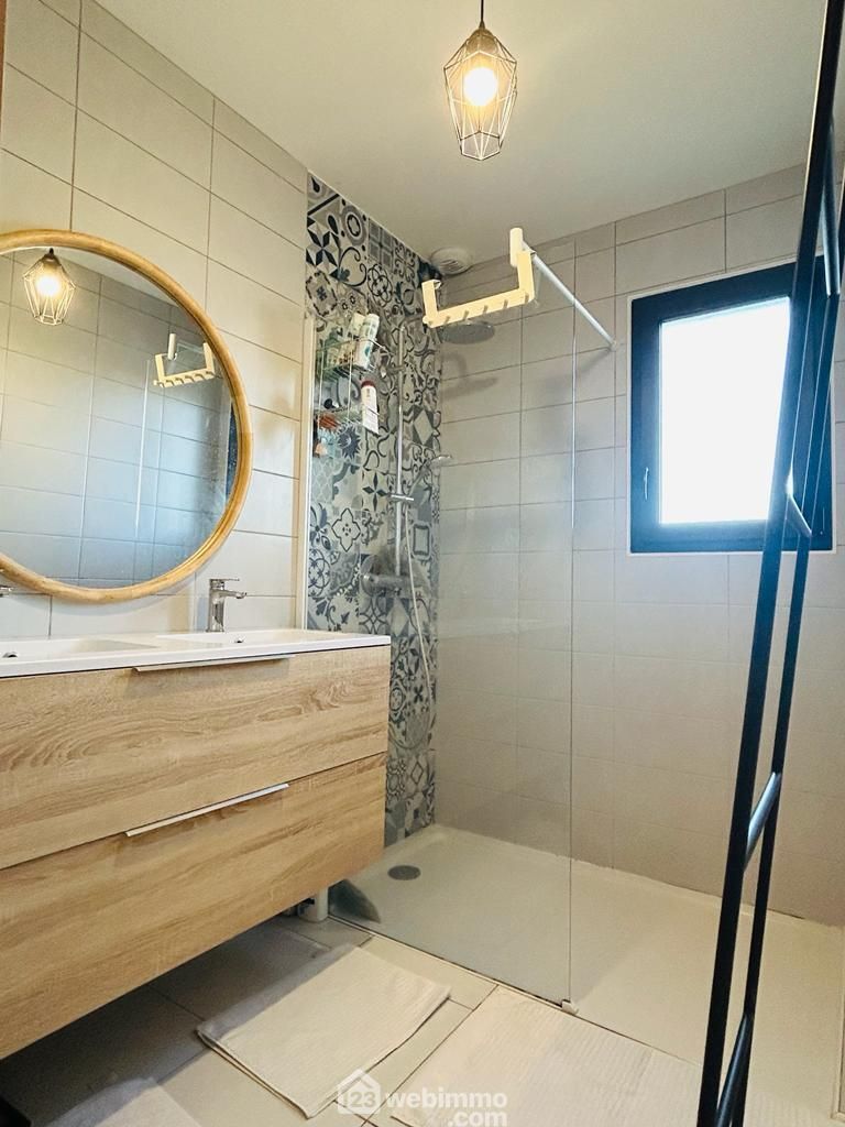 Au rez-de-chaussée, vous trouverez un bel espace de vie, une cuisine ouverte aménagée donnant sur l'espace extérieur avec une piscine, ainsi qu'une suite parentale : chambre, salle d'eau, dressing.