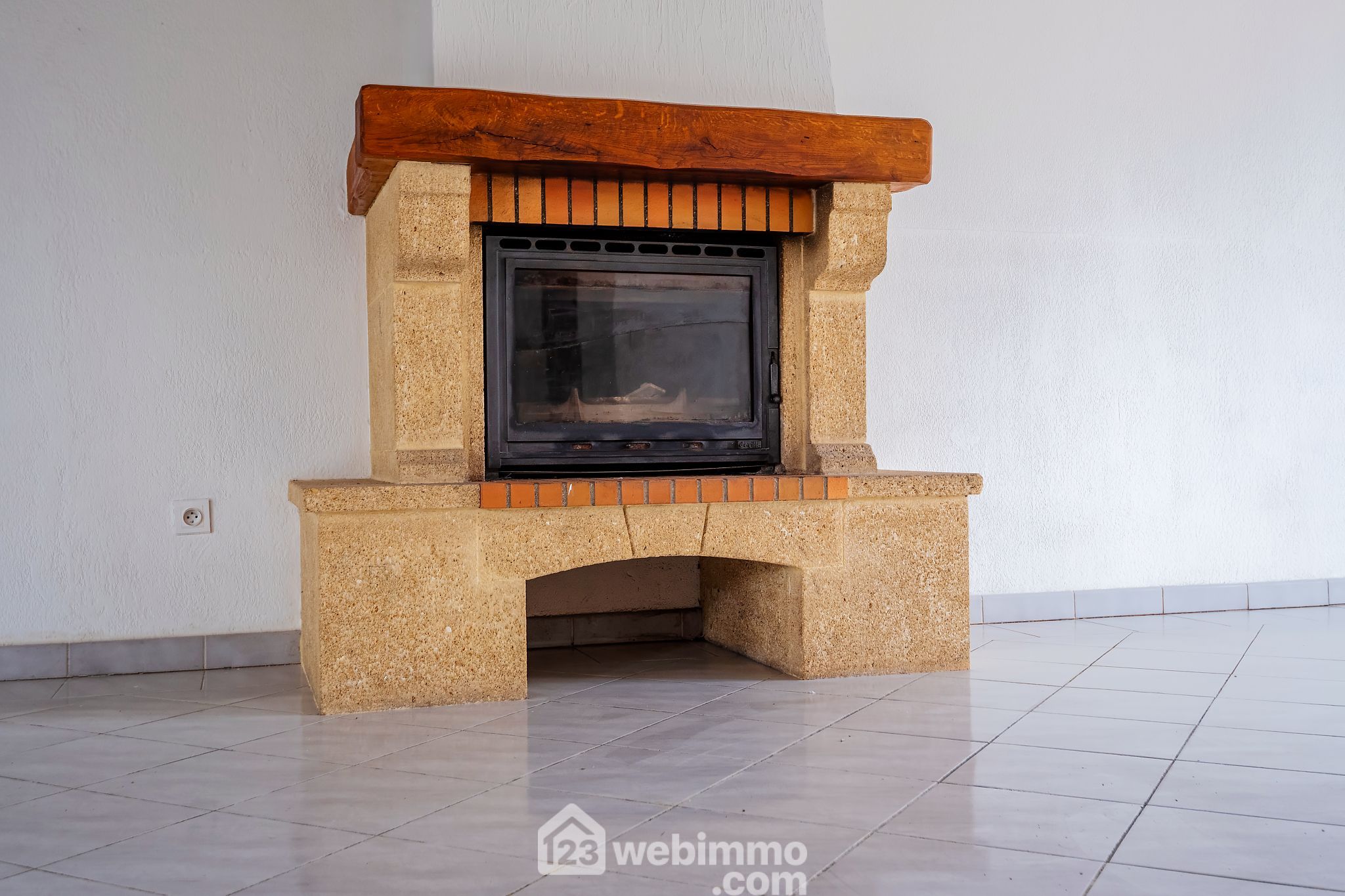 Un séjour cathédrale de 45 m² avec cheminée/insert et cuisine ouverte, traversant et lumineux, offre un espace très actuel.