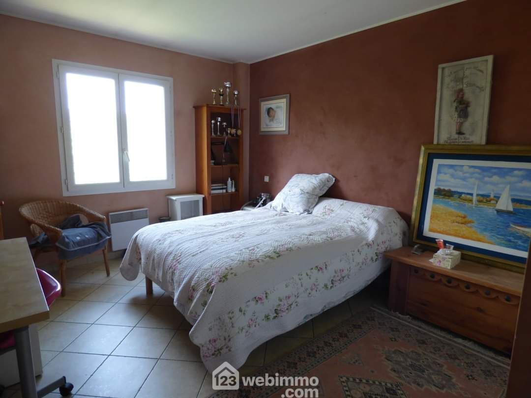 Au dessus, par escalier béton et dalle béton, deux très grandes chambres de 13 et 14m². Salle de bains et wc.