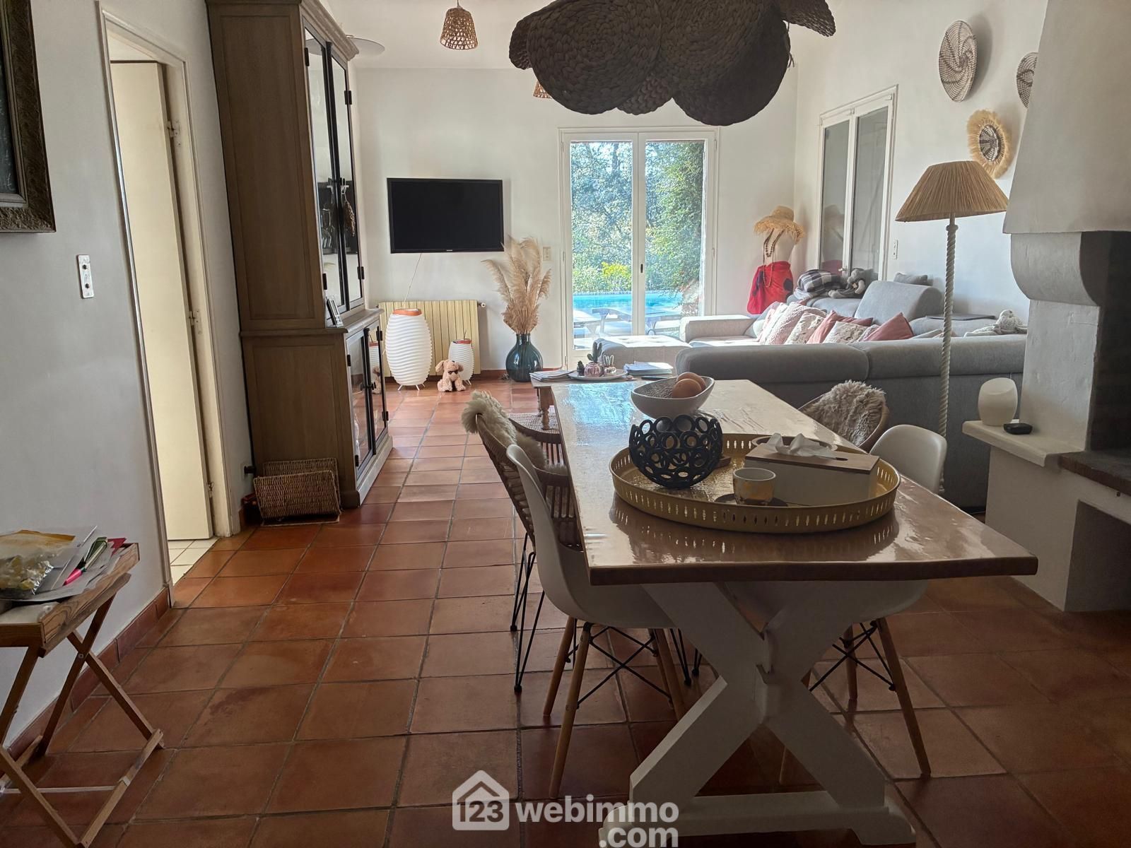 Entrée dans une confortable pièce de vie avec cheminée et climatisée, La pièce de vie se prolonge sur une grande terrasse. Une cuisine fonctionnelle et toute aménagée.
