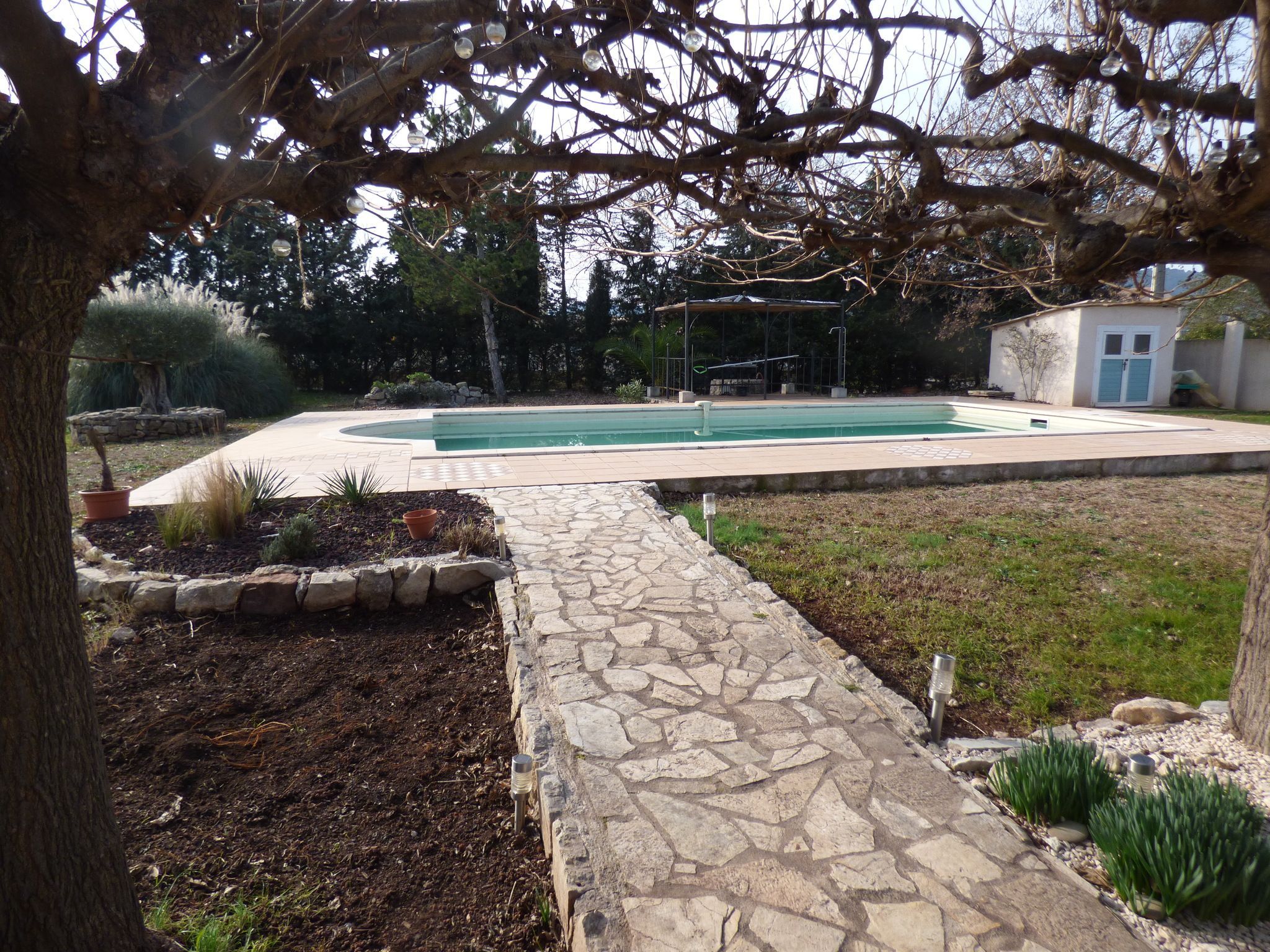 Sur le terrain, tout plat de +2000m², piscine 10x5m et grandes plages.