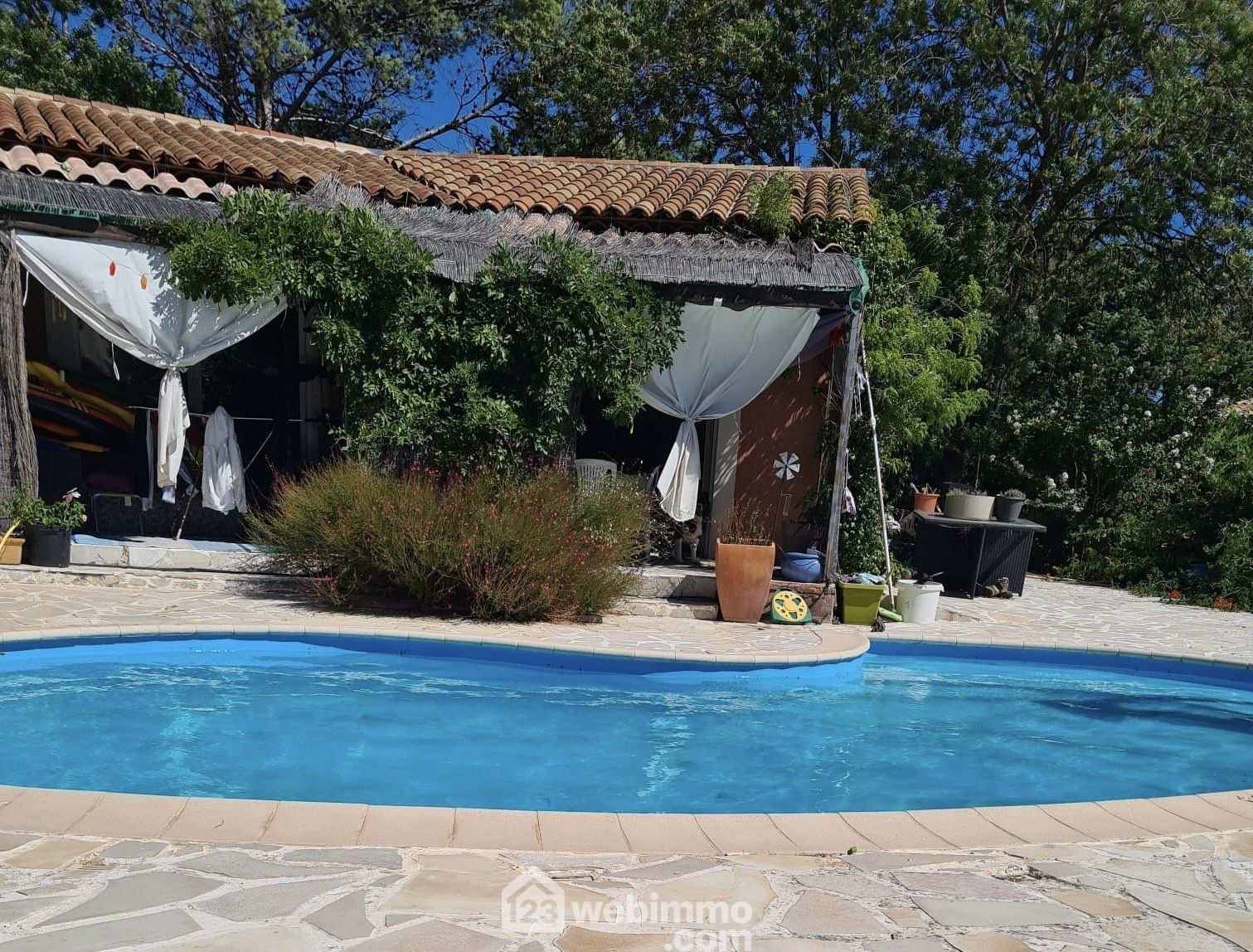 On accès de à la propriété par un portail électrique. Maison indépendante et d'une solide qualité de construction. La maison est agencée ainsi: un open space avec séjour climatisé se prolongeant sur terrasse et piscine, cuisine ouverte et aménagée, de plain pied: 3 chambres dont une suite parentale et une salle d'eau commune aux deux chambres (ultra pratique), une buanderie et un garage confortable.