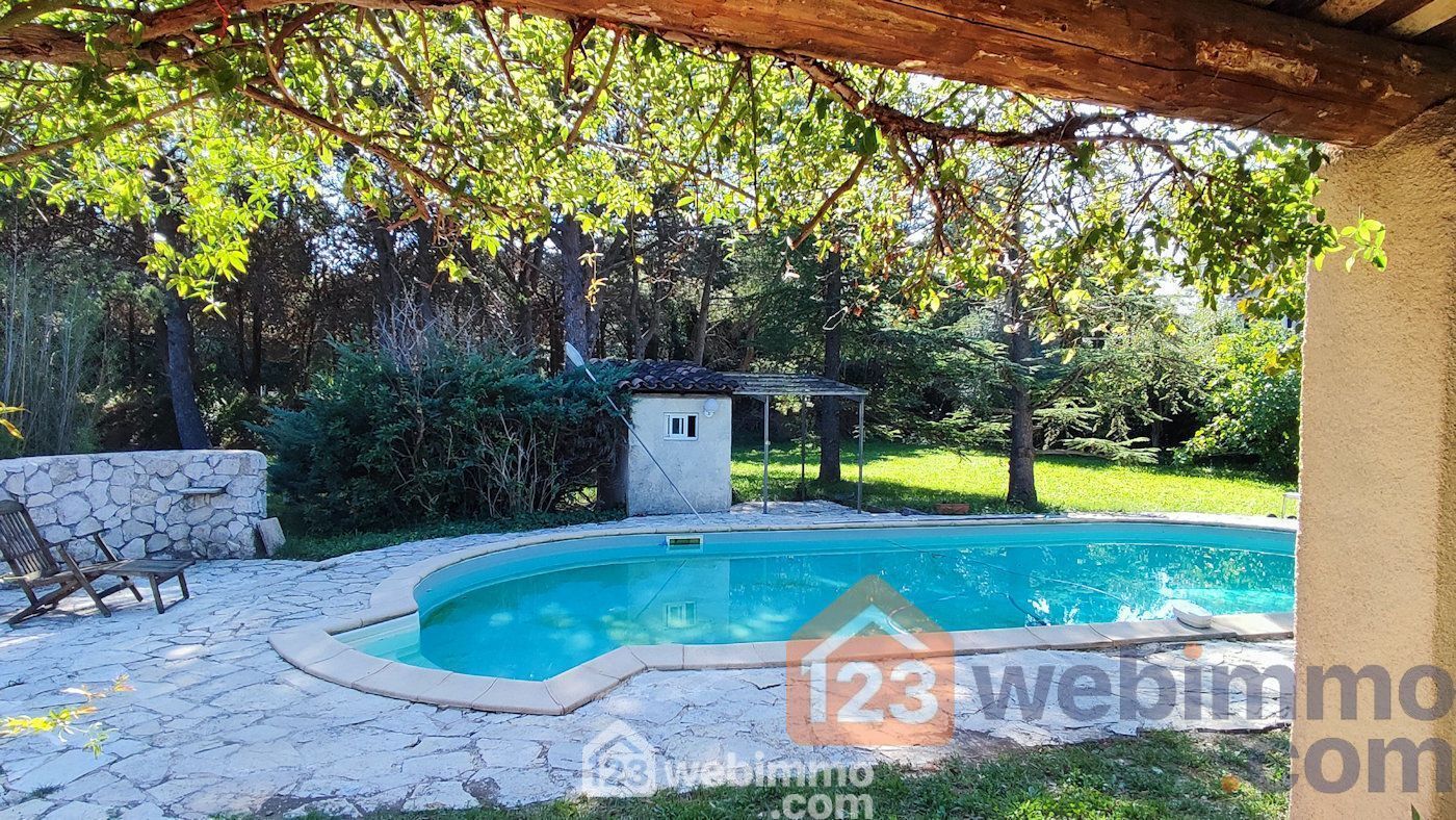 Le terrain, planté de grands arbres, abrite une piscine de 11 mètres et bénéficie d’un raccordement à l’eau du Canal de Provence.