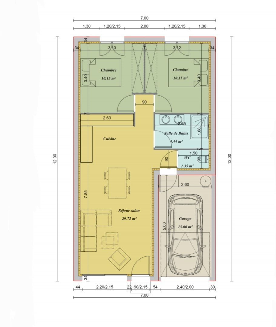 Séjour avec cuisine aménagée, deux chambres , une salle d'eau et un WC indépendant,