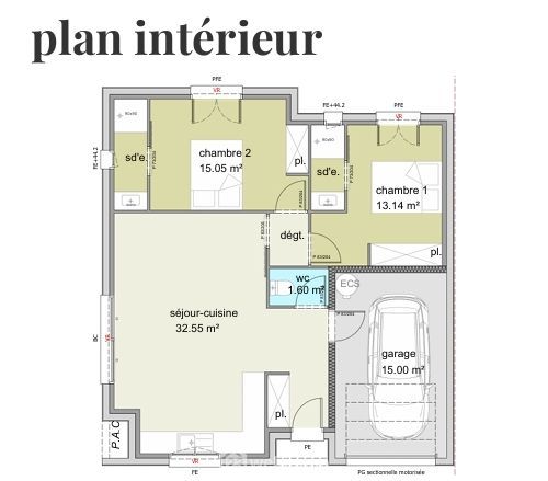 Une villa neuve de plain-pied, trois faces, respectant la norme RT2020, avec un séjour et cuisine ouverte, deux chambres chacune avec sa propre salle d'eau, un garage et un parking.