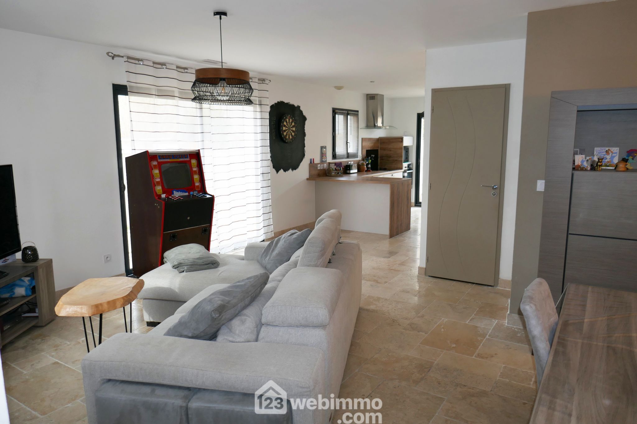 Visite virtuelle disponible sur demande. Proche de tous commerces, villa T4 de 2015 de 90m² sur 300m² de terrain. Au RDC: Entrée, dressing d'entrée, pièce à vivre 41m² avec cuisine aménagée et équipée, chambre parentale 14m² avec salle d'eau, WC séparé. A l'étage deux chambres donnant au sud de 11m² avec placard, WC séparé, salle de bains. Garage avec grande mezzanine. Volets roulants électriques, climatisation réversible gainée dans toutes les pièces. Terrasse avec pergola, jacuzzi, barbecue, terrain de boules.